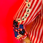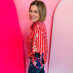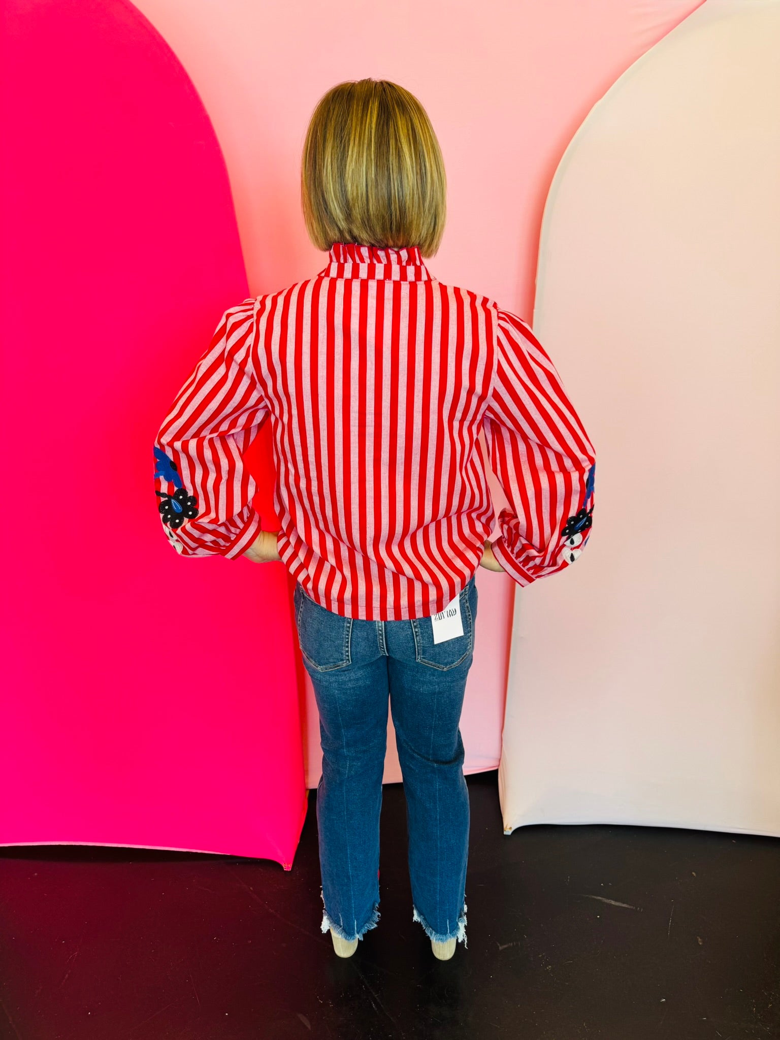 Add feminine charm to a timeless classic with the Red Floral Embroidered Stripe Shirt, a standout piece that brings texture and personality to everyday style. Crafted from 100% cotton, this blouse is breathable, lightweight, and easy to wear year-round. The red-and-white striped pattern creates a crisp, polished base, while the floral embroidery on the sleeves adds a bold, eye-catching element. Thoughtful details like the ruffle trim along the button front and puff sleeves bring playful volume and a touch of romance to this tailored silhouette. Perfect for the office, brunch, or casual outings, this embroidered stripe shirt can be tucked into trousers or styled with denim for versatile wear. Equal parts classic and chic, it’s a blouse designed to make a statement without sacrificing comfort.