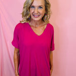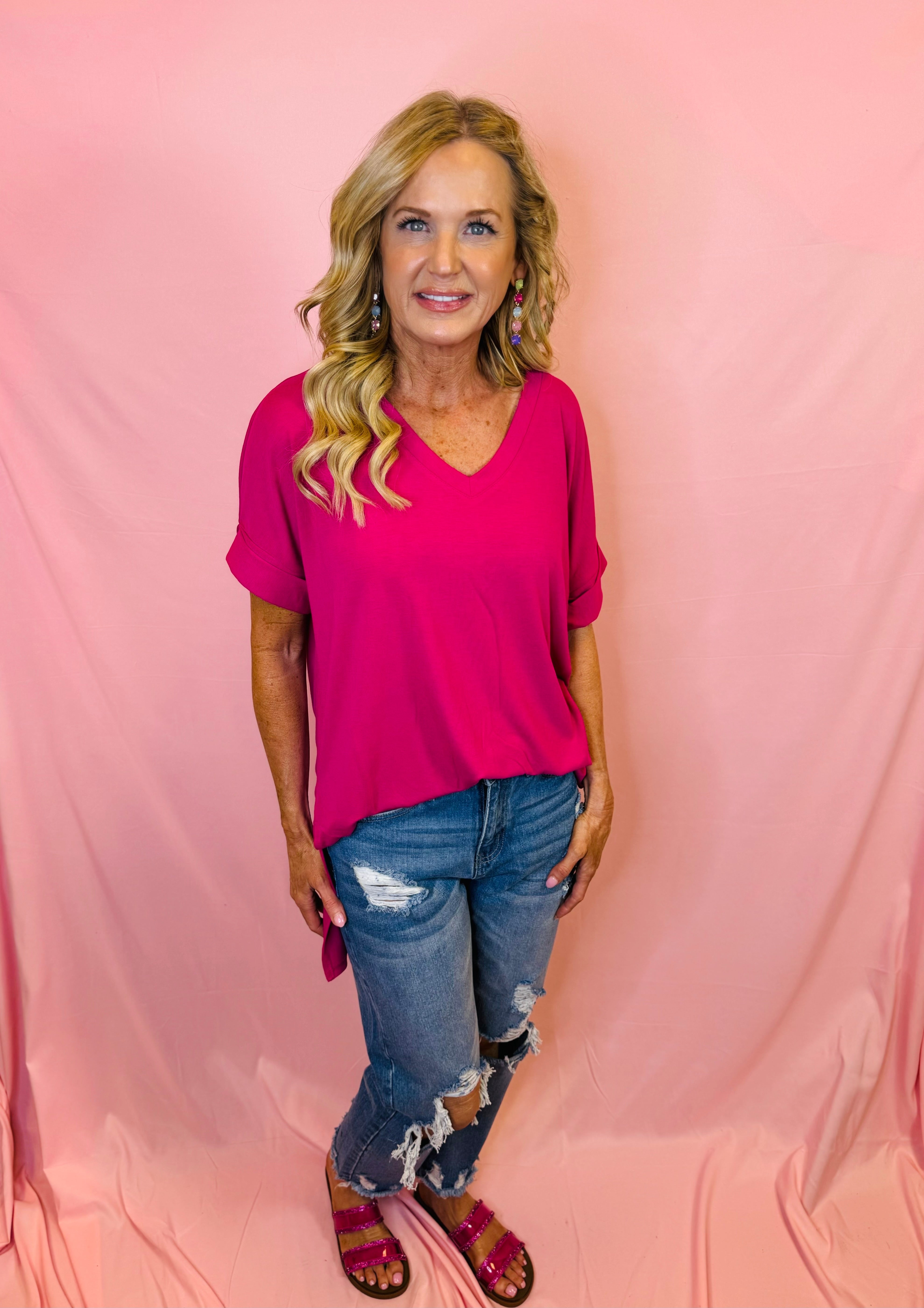 Elevate your style with our Magenta Rolled Sleeve V-Neck Top. Featuring rolled sleeves and a side slit high-low hem, this versatile top is perfect for a modern and chic look. Made from super soft fabric, it's also comfortable to wear. Upgrade your wardrobe today!