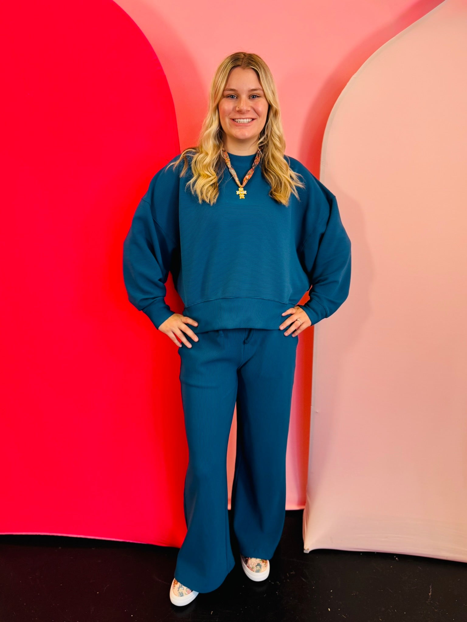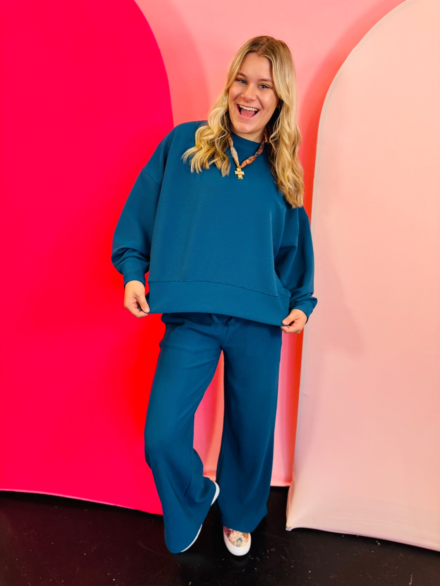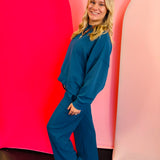 The Teal Ribbed Round Neck Pullover & Pants Set delivers effortless, trend-right style with the perfect blend of cozy warmth and everyday versatility.