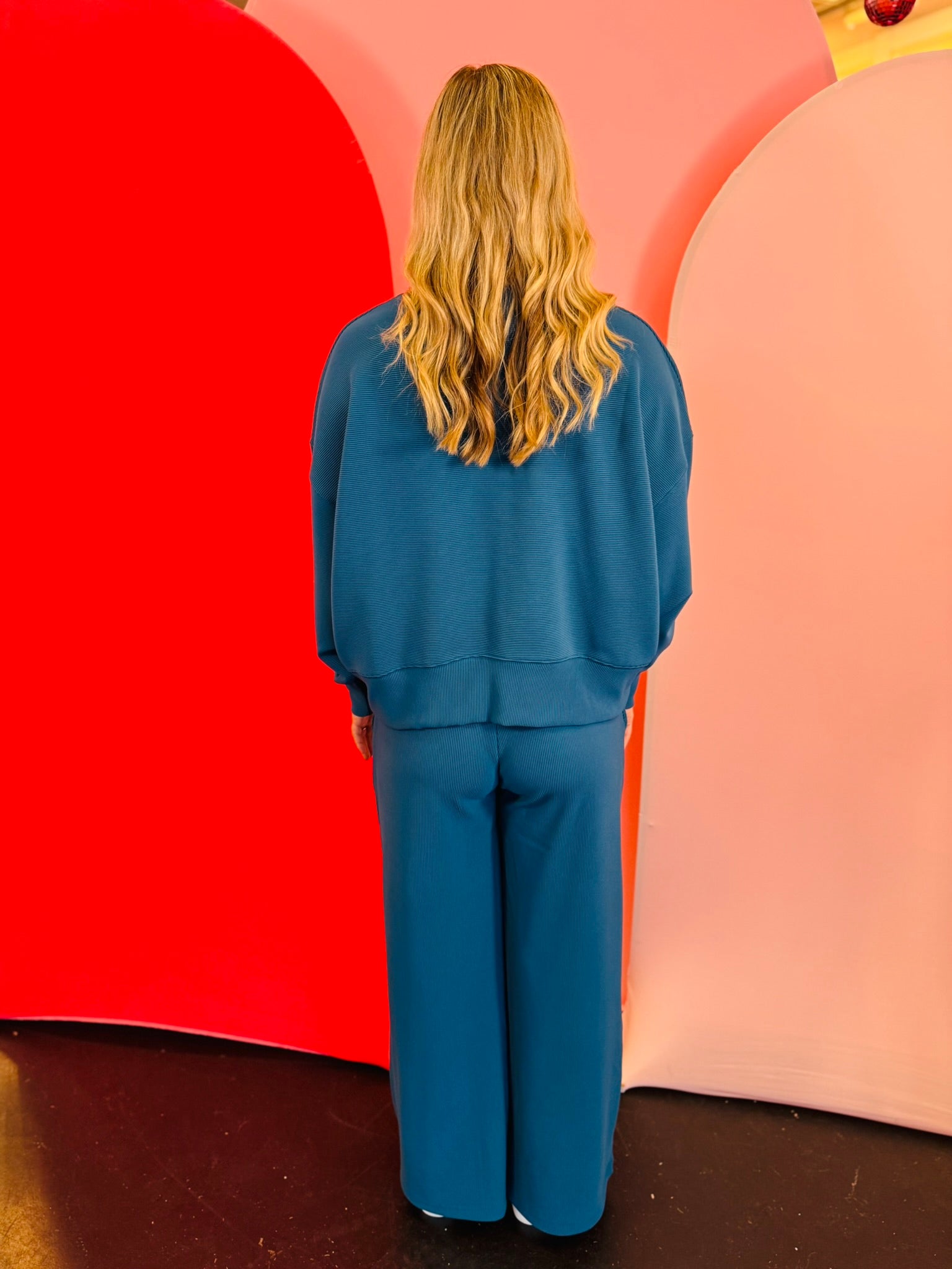 Two-piece teal ribbed knit set with pullover and pants