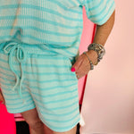 Turquoise ribbed striped tee and shorts lounge set with relaxed fit and elastic-waist shorts.