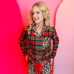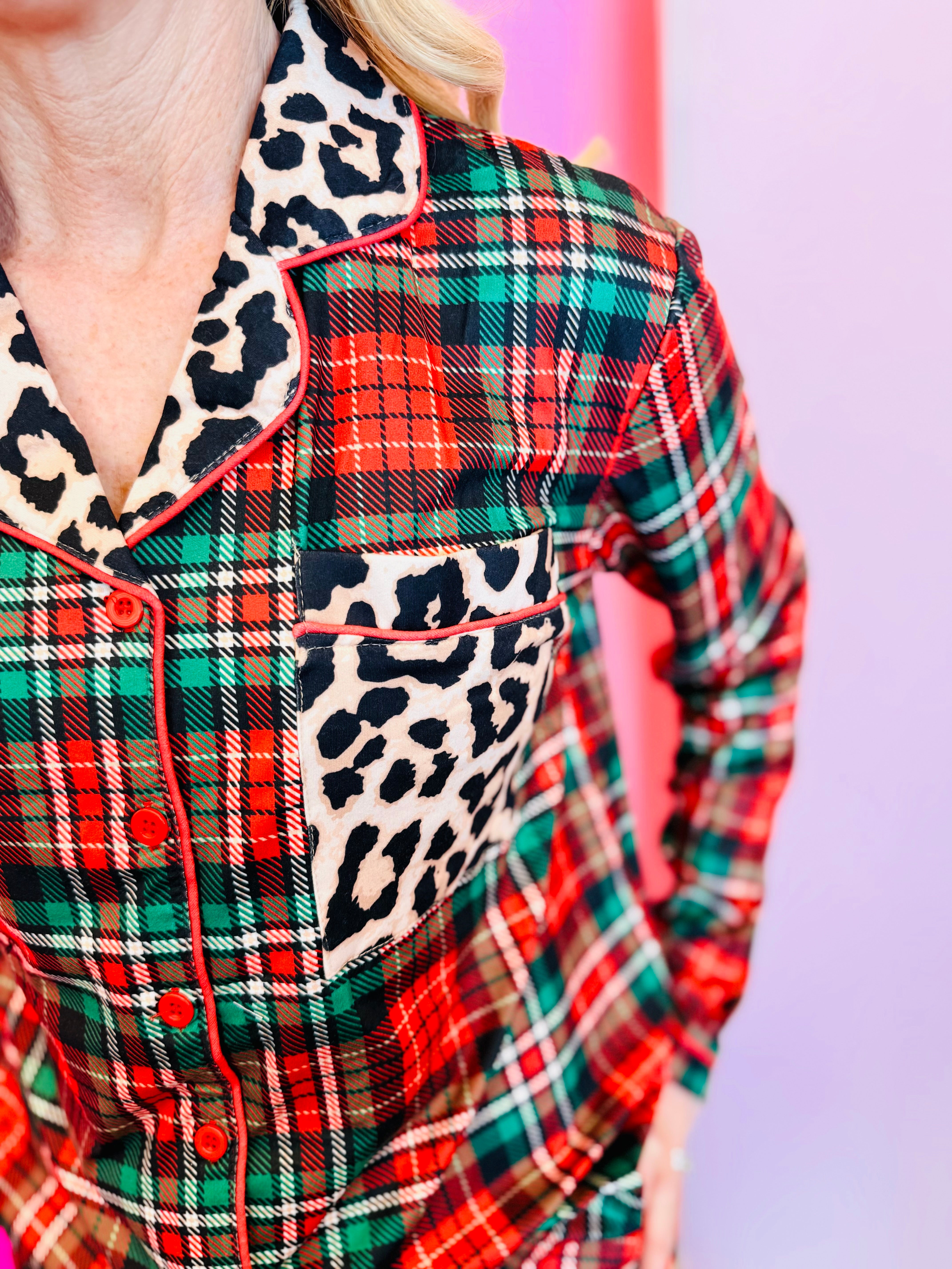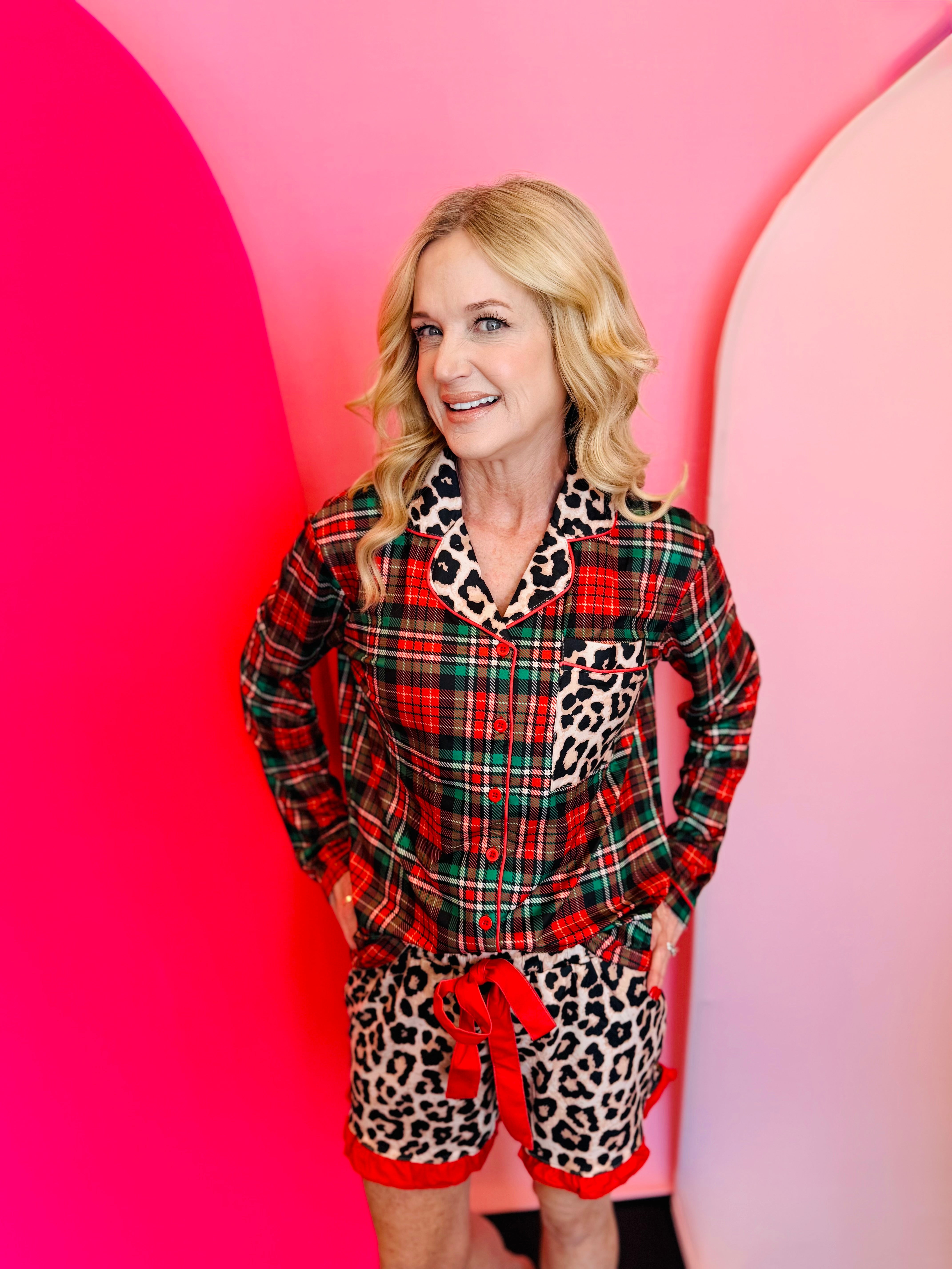 Unwrap cozy style and bold personality with the Wrapped In Safari Chic Ruffle Pajama Set, a playful mix of festive flair and fierce fashion. This fun two-piece set pairs a long-sleeve red and green plaid top with a leopard print collar and chest pocket, creating the perfect blend of holiday cheer and wild sophistication.