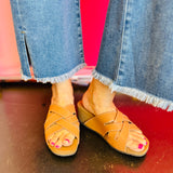 The CLEVER sandal features a new wedge shape in our popular hybrid sandal collection. The lightweight cork wedge features a modern square toe shape, set atop with our Signature Yellow Box EVA footbed for all day comfort. This classic woven slide silhouette will make this your go-to wedge.