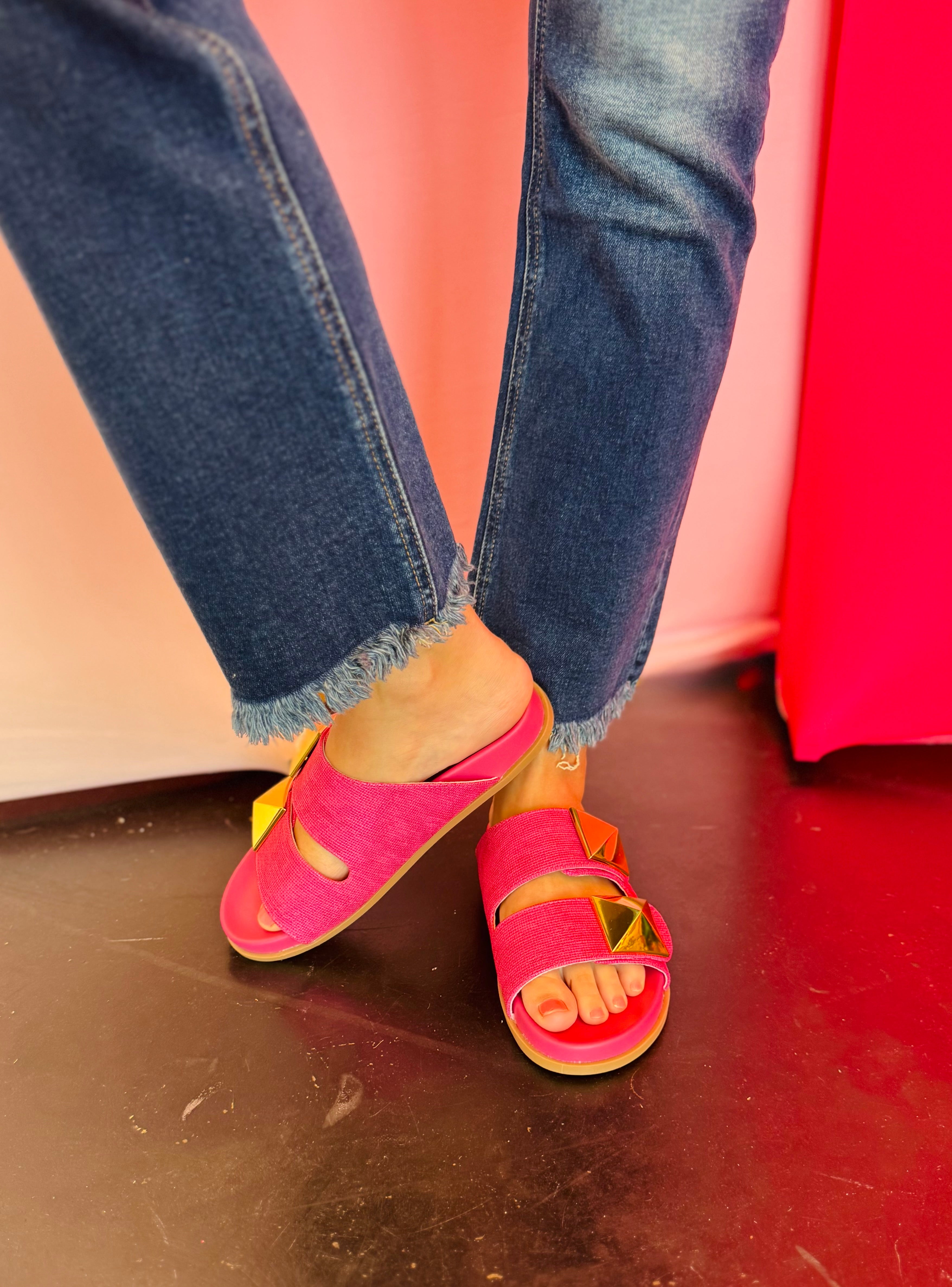 Step into bold elegance with our BERNARDA slides, now in a striking fuchsia color. These sandals feature wide straps crafted from textured woven fabric, combining effortless comfort with eye-catching design. The oversized gold-tone metallic studs lend a contemporary and luxurious touch, perfect for adding an edgy flair to any casual look. With their molded footbeds, these slides ensure all-day comfort, making them the ideal choice for your summer wardrobe