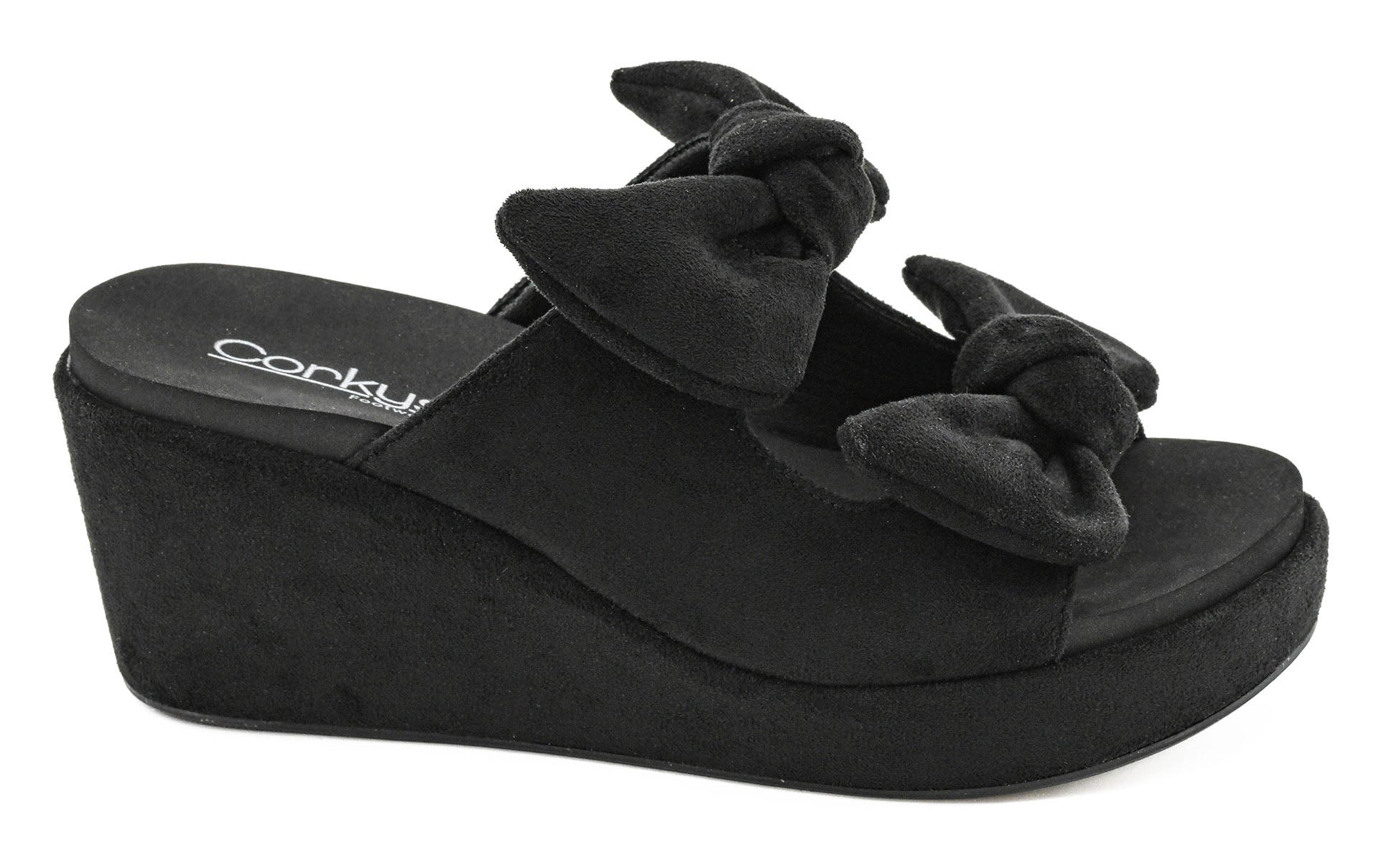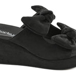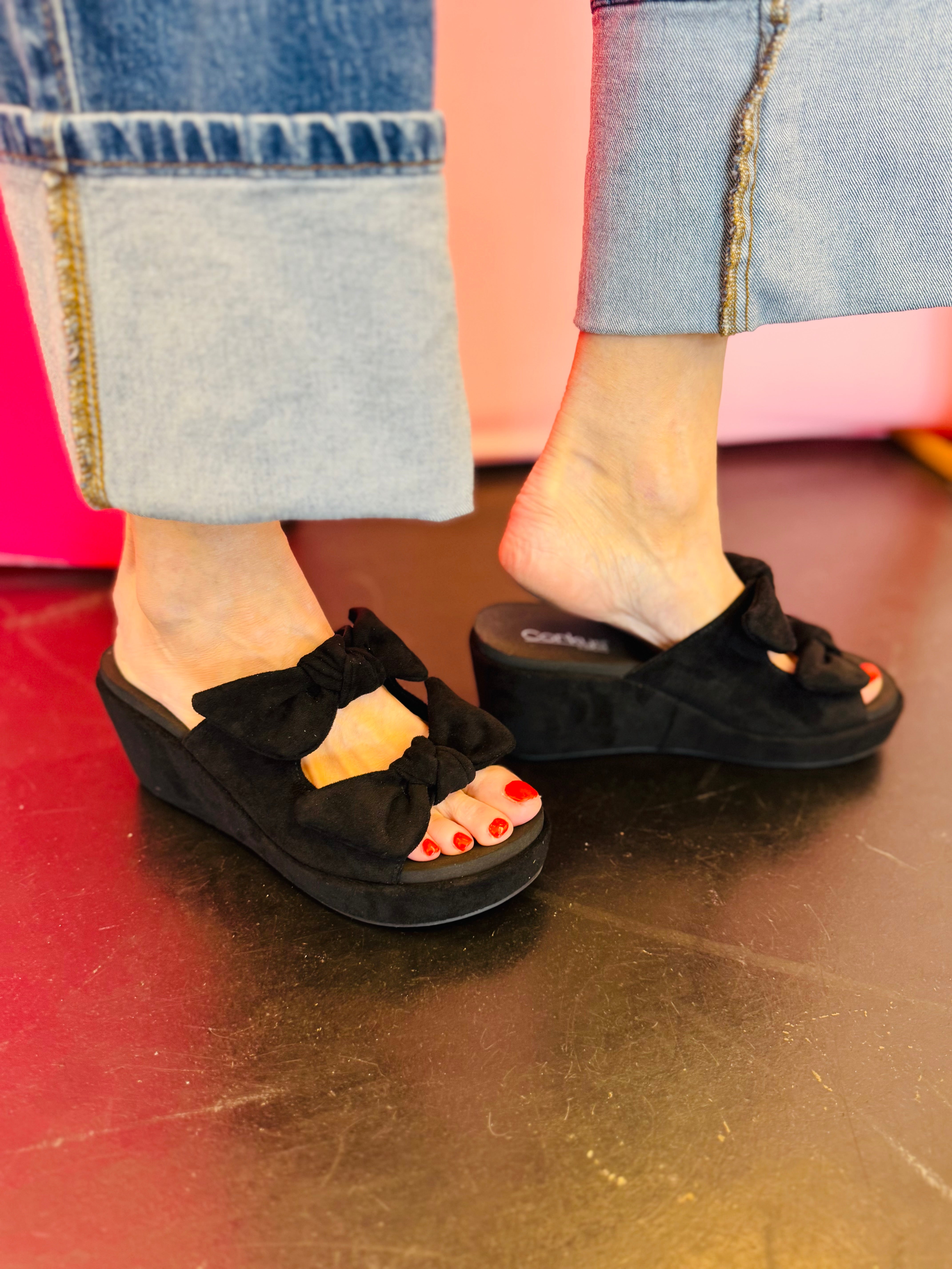 Step into effortless chic with the Bowed Up Black Faux Suede Sandals, a stylish blend of comfort and playful design. These wedge sandals feature wide black faux suede straps topped with oversized bows, adding a bold, feminine touch that elevates any outfit. The cushioned sole ensures all-day comfort, while the easy slip-on style makes them perfect for on-the-go wear. With their wedge heel, these sandals deliver just the right amount of lift without sacrificing stability, making them a versatile choice for both casual and dressier occasions. Pair them with sundresses, denim, or skirts for an easy upgrade to your everyday look. Designed to combine comfort and fashion, the Bowed Up Sandals will quickly become your go-to pair for summer and beyond.