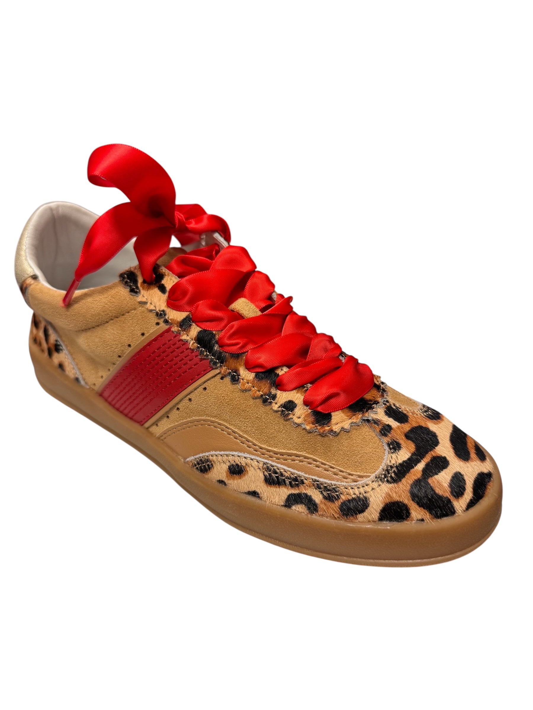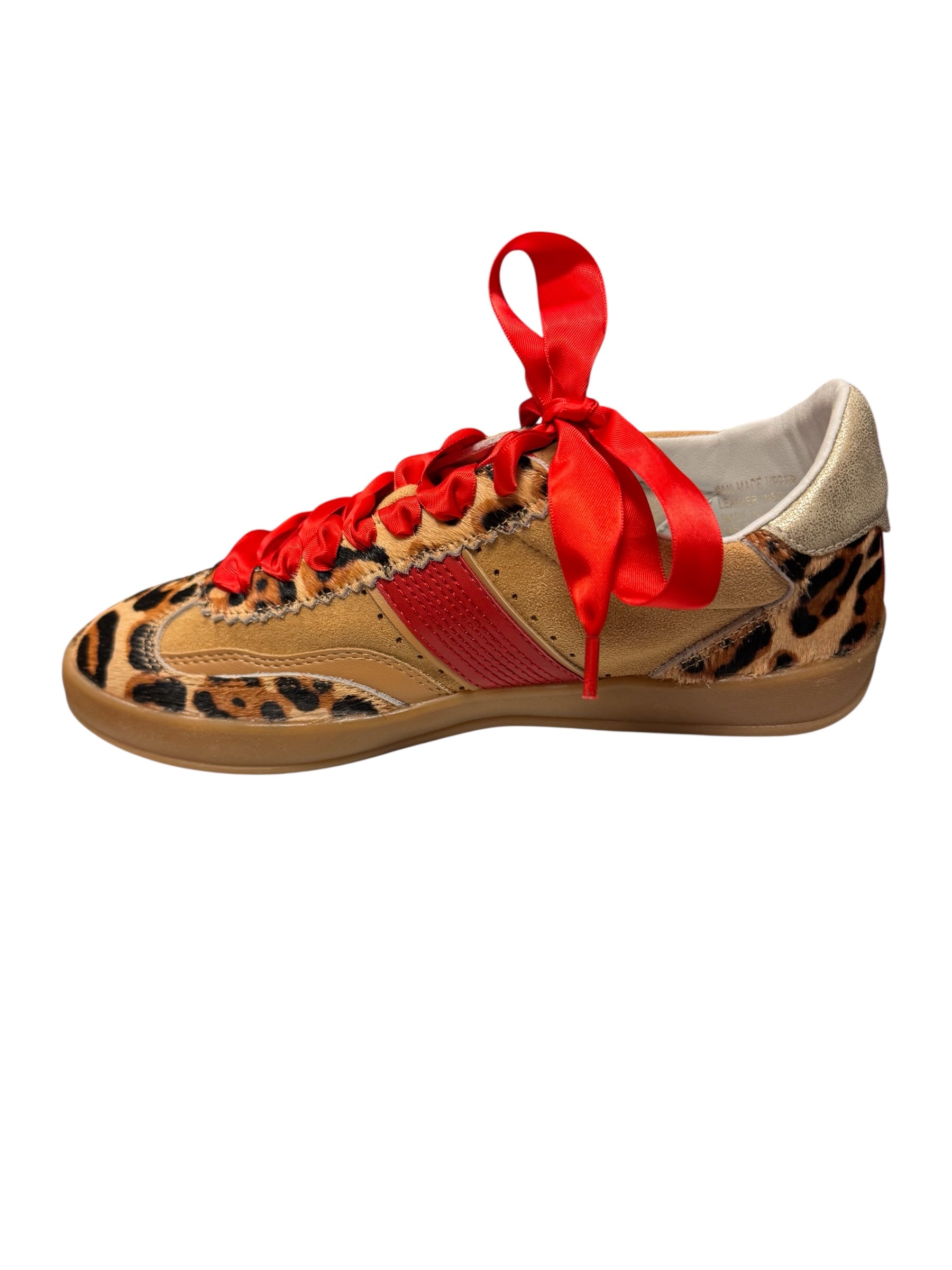Step into standout style with the Mi.iM Dixie Leopard Red Sneakers, the perfect blend of bold fashion and everyday comfort. Featuring a sand and leopard print suede upper, these sneakers are elevated by a striking wide red stripe along the sides and back for an eye-catching pop of color. Red satin laces add a luxe finish, while an additional pair of shimmer gold laces lets you switch up your look with ease. A distressed metallic gold heel tap gives these sneakers a modern, edgy vibe, and the plush cushioned insole keeps every step comfortable. Set on a durable gum sole with a 0.75" height, these sneakers are designed for all-day wear while making a bold statement in your wardrobe.