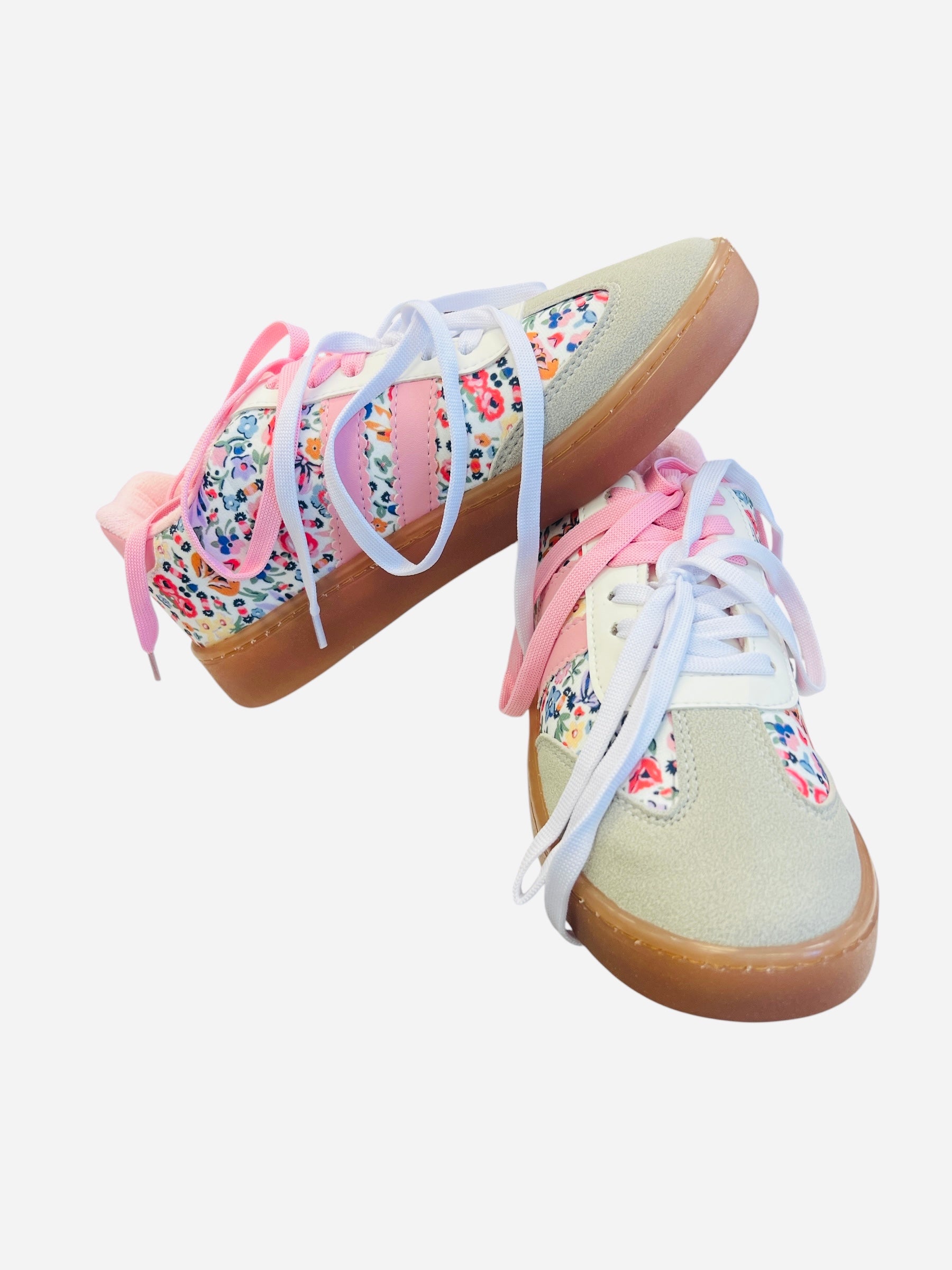 Add a fresh pop of personality to your footwear collection with our Emma Pink Floral Sneakers. Featuring a chic brown and white base with eye-catching pink laces, these sneakers bring a fun twist to any casual look. The unique floral print adds a touch of feminine flair, making them a standout choice for everyday wear. Designed for comfort as much as style, they’re perfect for errands, brunch dates, or weekend adventures. Pair them with jeans, dresses, or shorts for an effortlessly cool vibe.