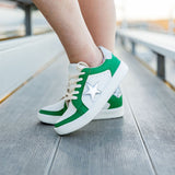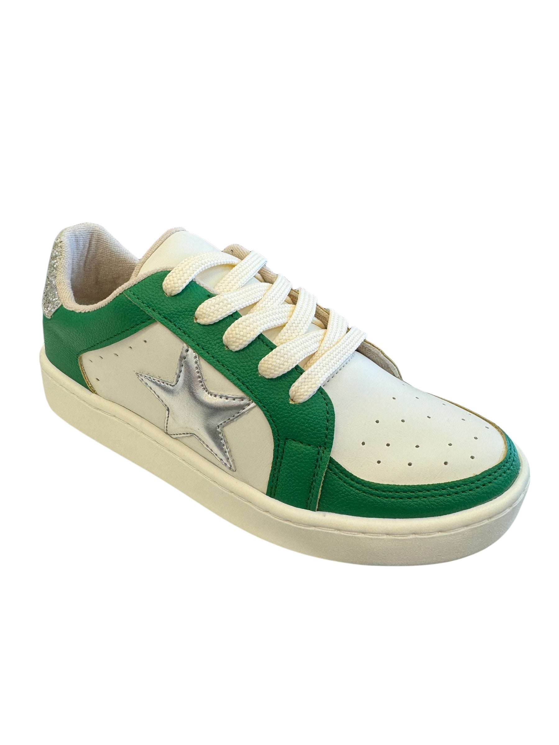 Elevate your sneaker game with Miel 56's Green and Silver Sneakers. Perfect for Game Day or just because green is in, these kicks feature a comfortable soft insole and a metallic silver star for added flair. Green and white color combo makes these sneakers a winning style choice!