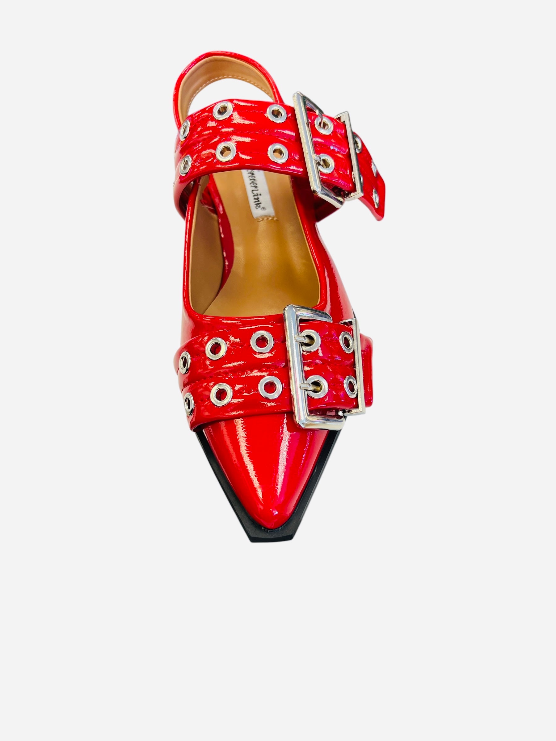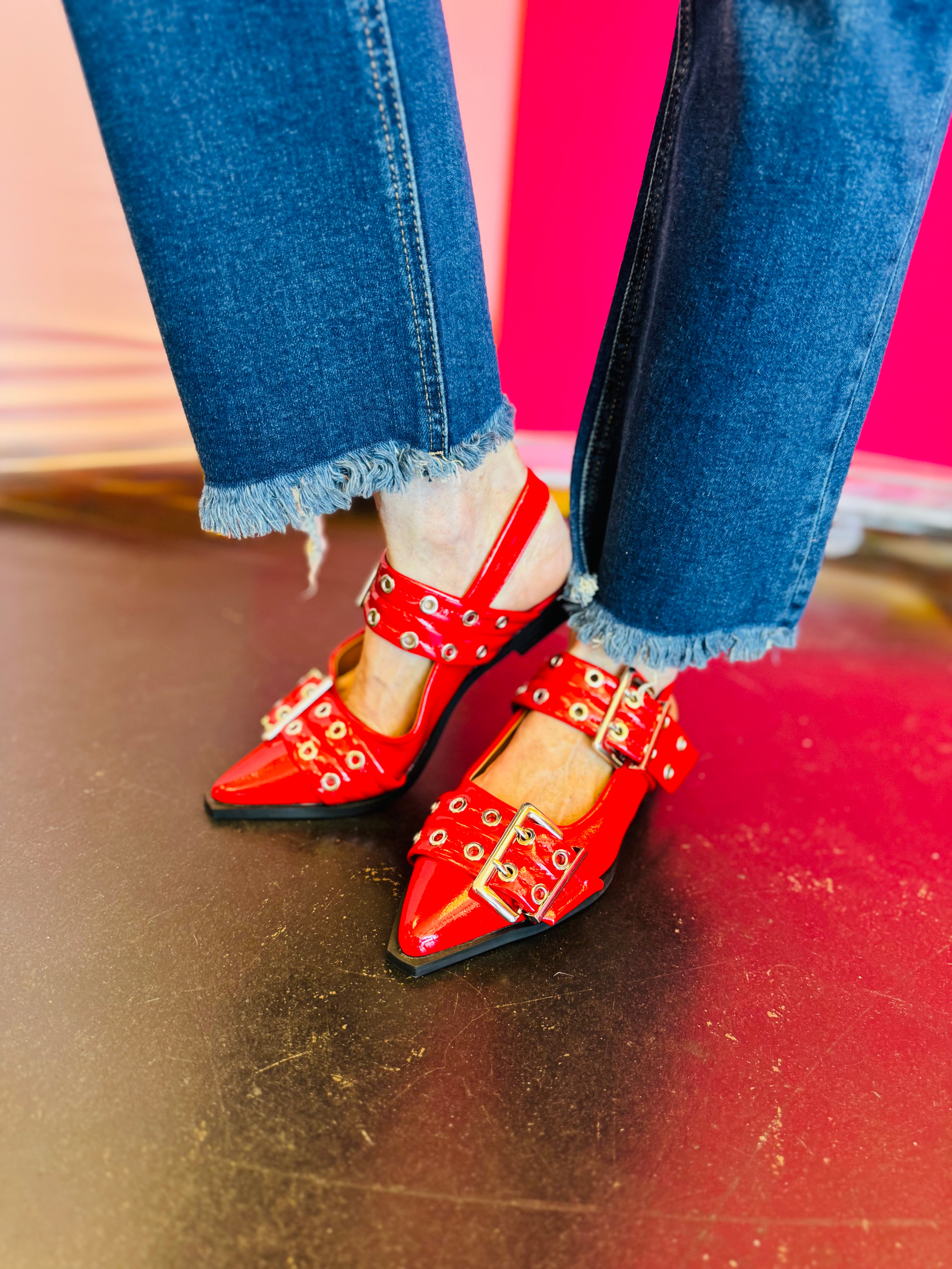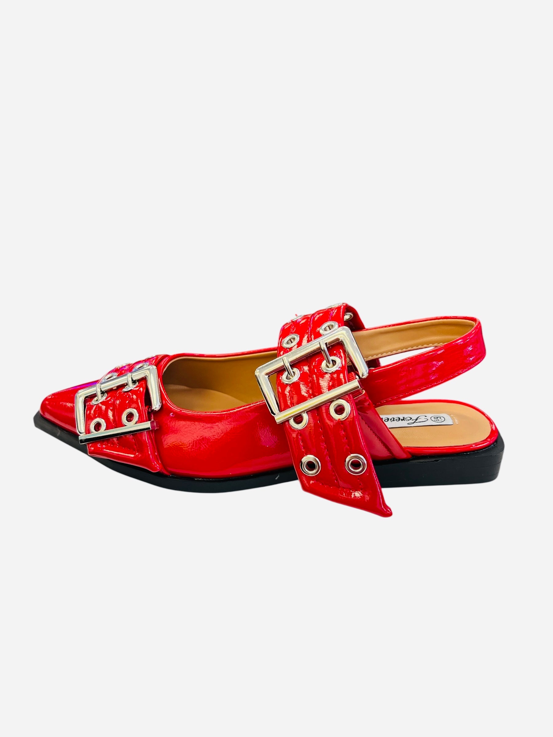 Step into bold elegance with the Red Buckled Flats—a perfect mix of fiery attitude and sleek sophistication. These standout shoes feature double silver buckle straps, a pointed toe, and a modern slingback design that adds both edge and comfort. The rich red hue brings a powerful, confident touch to any outfit—whether you're dressing up denim or stepping out in your favorite dress. Designed for those who love to make a statement with every step.