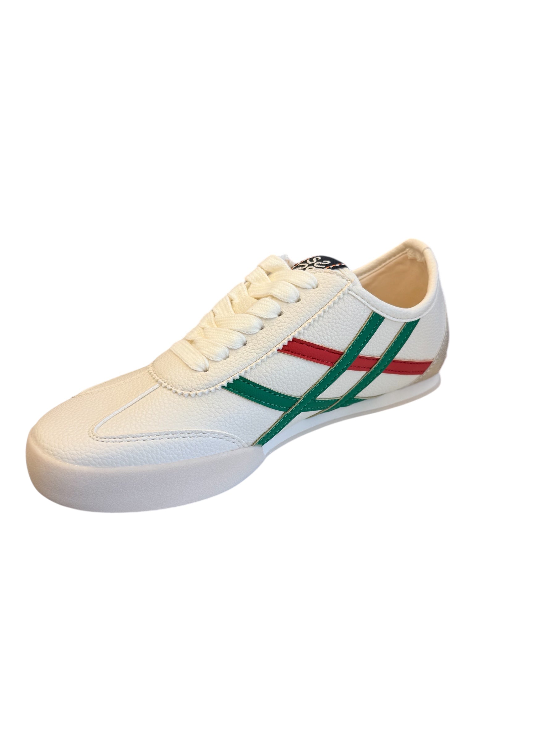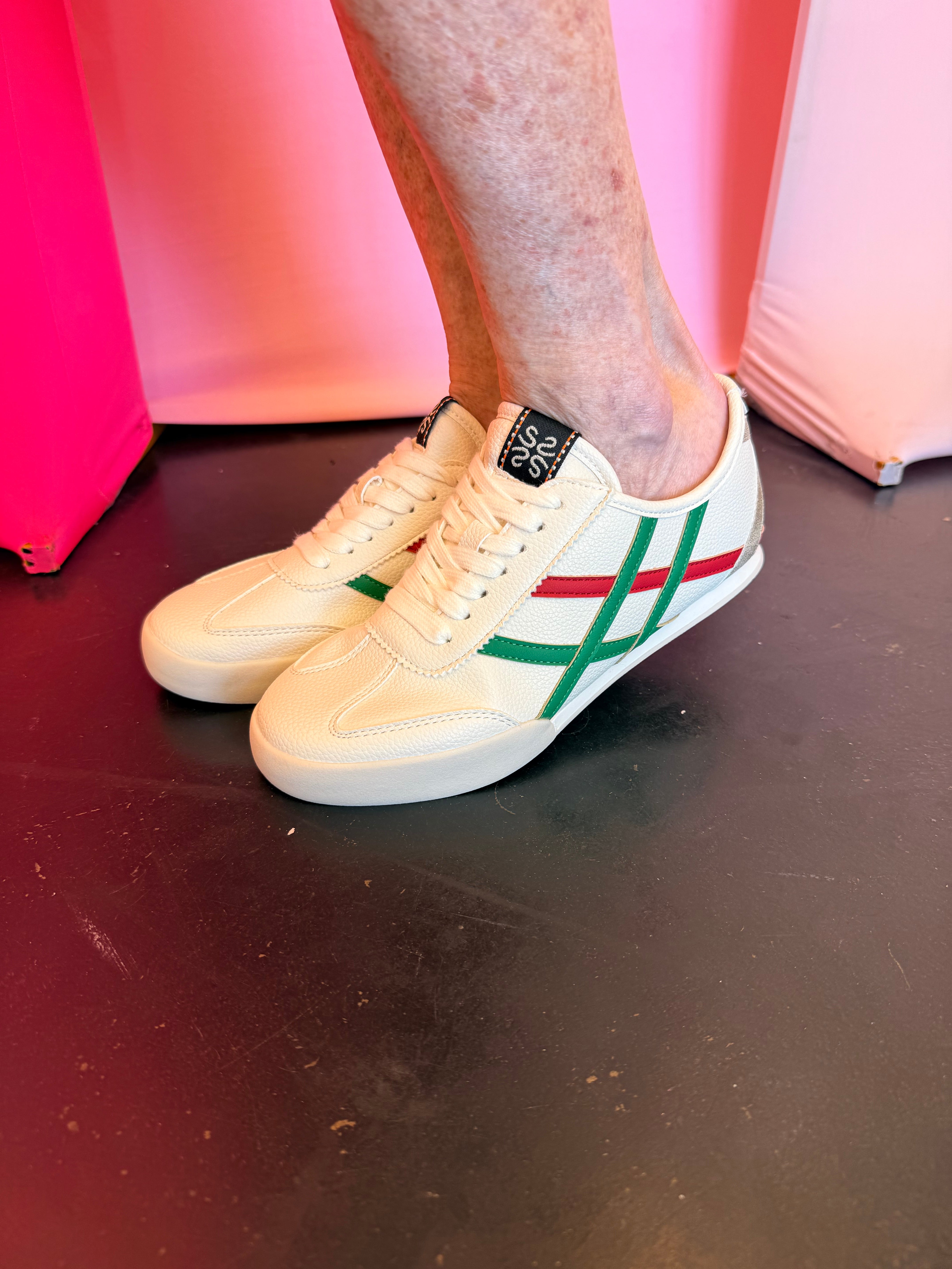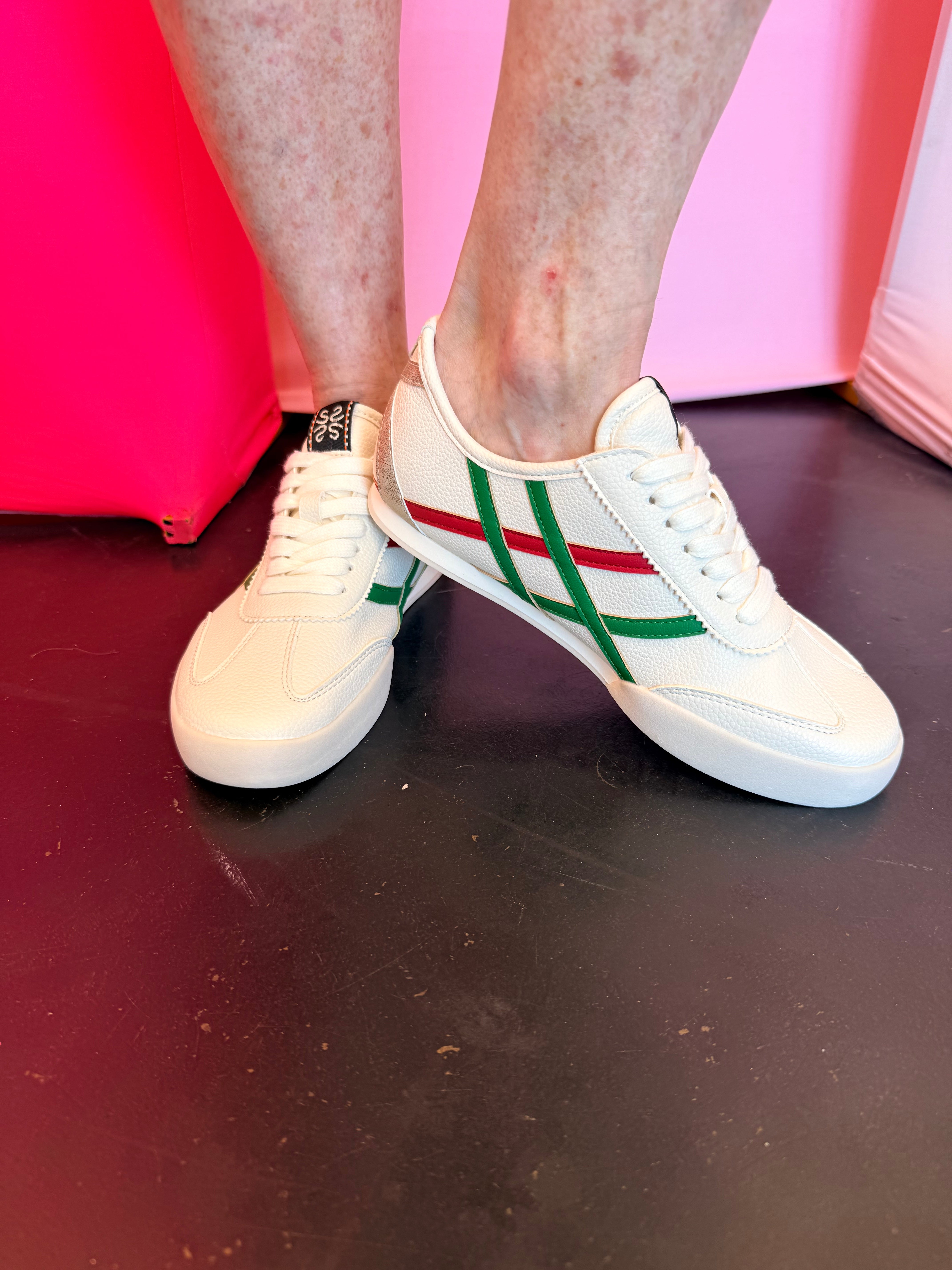 Step into effortless style with the Shu Shop Green & Red Retro Sneaker, a vintage-inspired design with modern comfort. Crafted with a soft, leather-like material, this sneaker offers a luxe look while staying lightweight and wearable for everyday outings. The iconic green and red side stripes give off a timeless, designer-inspired vibe, while the gold accent on the back heel adds a subtle pop of glam. Pair them with denim, athleisure, dresses, or casual workwear for a versatile look that transitions from day to night with ease.