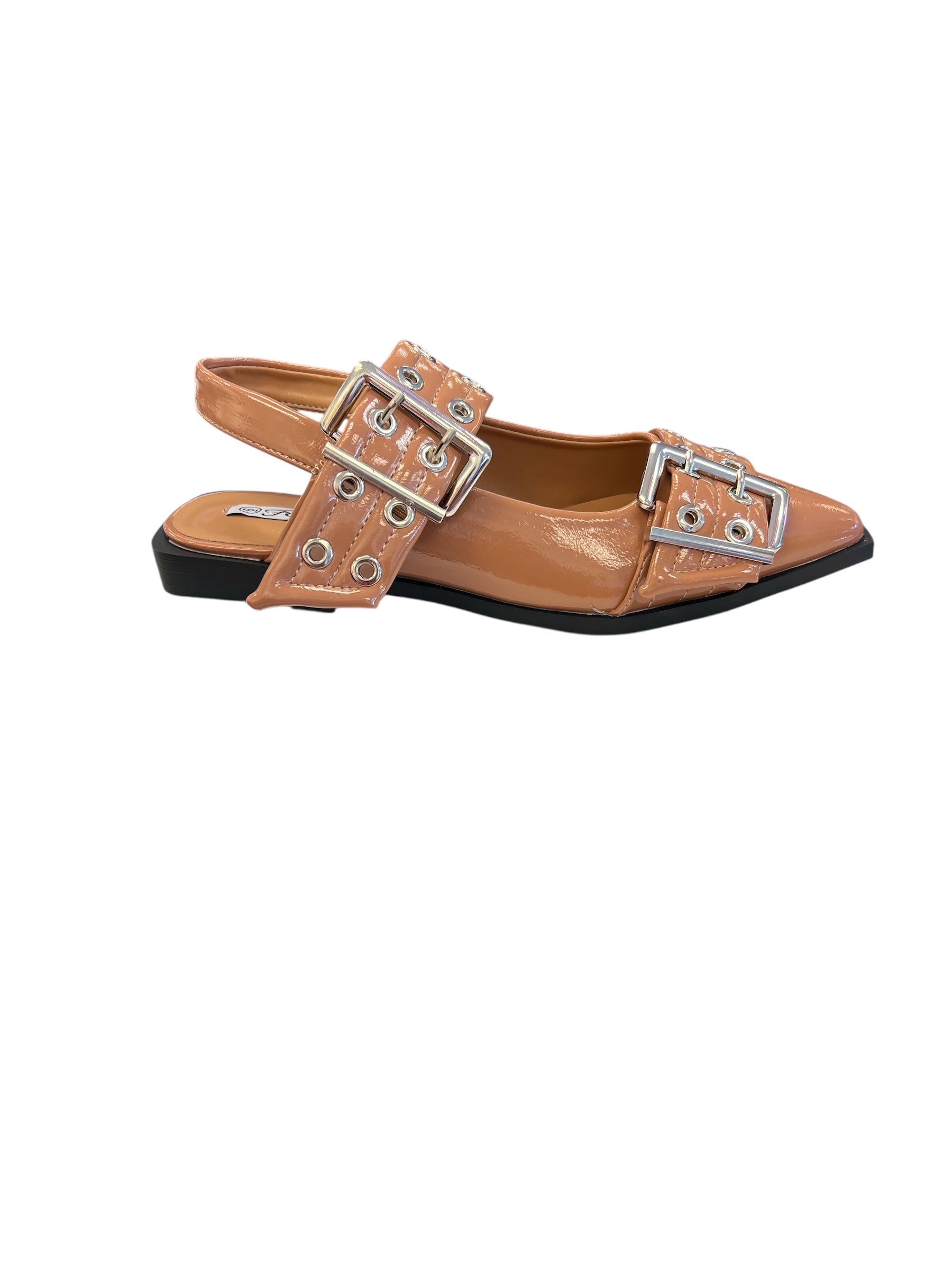 Elevate your everyday look with the Tan Buckled Flats, where neutral tones meet bold design. Featuring double silver buckle straps and a sleek pointed toe, these flats strike the perfect balance between edgy and refined. The versatile tan shade pairs beautifully with anything in your wardrobe, while the slingback silhouette offers a comfortable, secure fit. Whether you're dressing up for a meeting or down for weekend errands, these flats add instant polish and personality to your step.