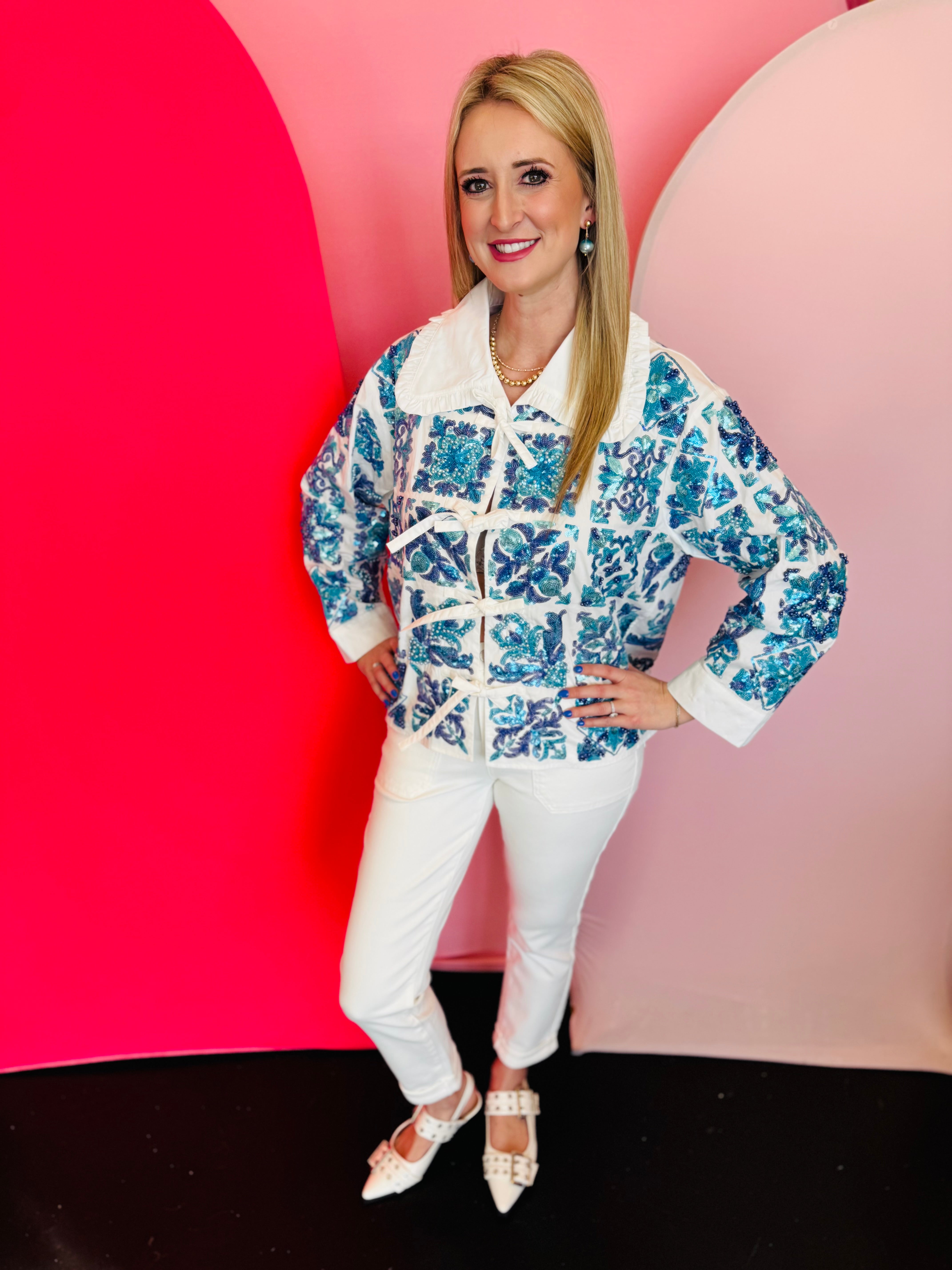 Queen Of Sparkles White & Blue Italian Tiles Tie Collar Long Sleeve Cotton Top