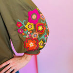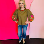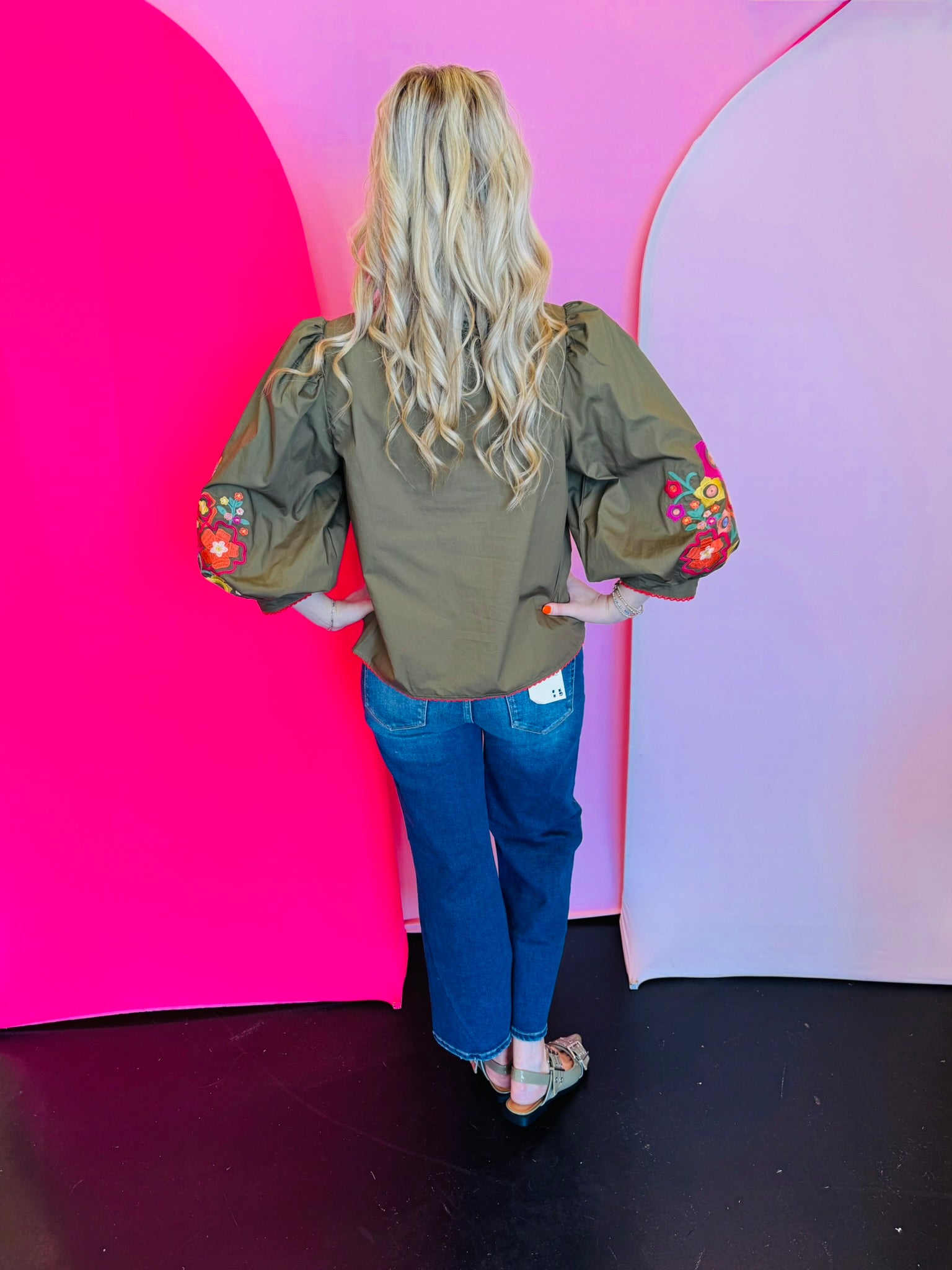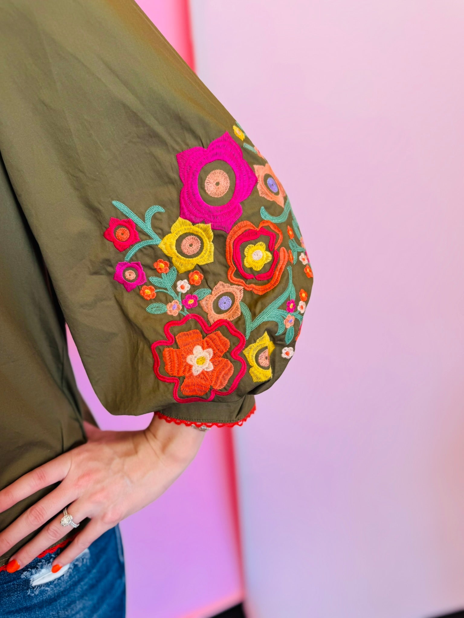 Floral embroidery along 3/4 balloon sleeves for artisanal detail