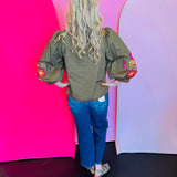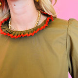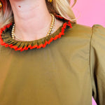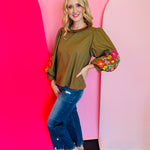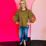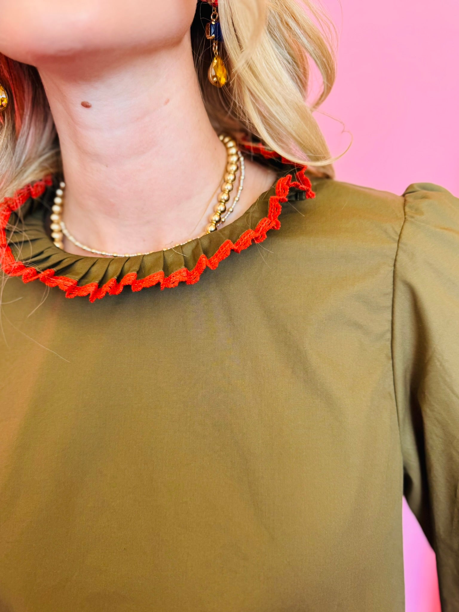Add timeless charm to your wardrobe with the Olive Bloom Embroidery Top, a beautifully detailed piece that blends elegance with artisanal design. Crafted from 100% cotton, this top features a ruffled mock neckline with delicate lace trim edging and vibrant red accents along the neckline, cuffs, and hem for a striking contrast. The 3/4 balloon sleeves are adorned with intricate floral embroidery, bringing rich texture and feminine flair to this classic silhouette. Lightweight and breathable, it’s the perfect top for transitioning between seasons while maintaining effortless sophistication.