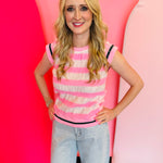 Elevate your casual wardrobe with our Pink Striped Accent Top. Featuring a round neckline and flattering fit, this versatile sleeveless top is perfect for warmer days or layering. Enjoy comfort in the soft, textured stripe knit fabric, while the contrast striped band detailing adds a playful touch. From jeans to skirts, this top offers a relaxed yet stylish look.