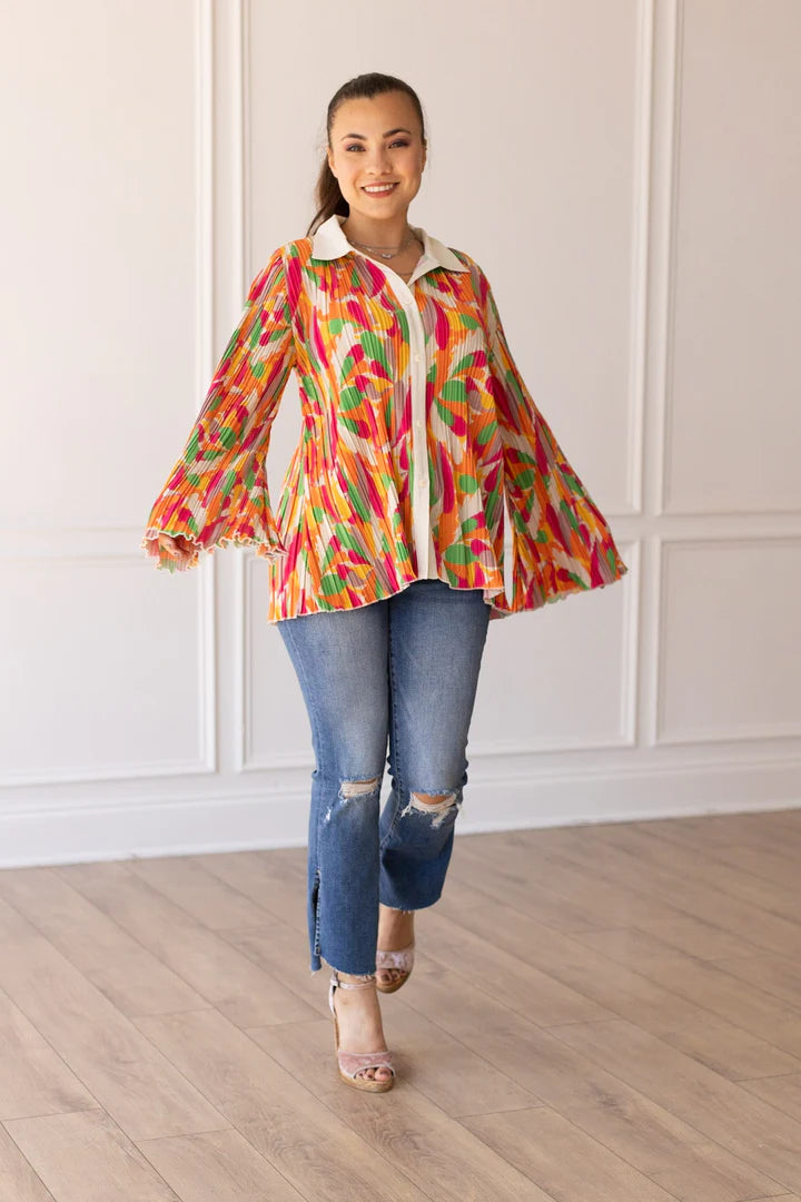 Elevate your wardrobe with our Pleats and Petals Flare Sleeve Top, a chic and feminine piece that effortlessly combines sophistication with trendy details. The top features elegant pleats for a touch of refinement, while the flare sleeves add a playful and fashion-forward element. Perfect for both casual and dressier occasions, this top brings a balance of style and versatility to your collection.