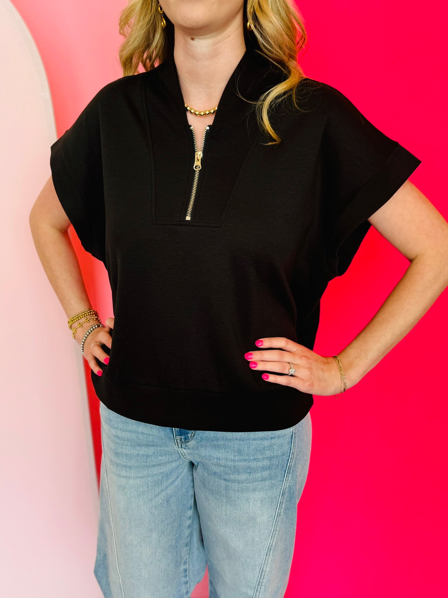 Black scuba high neck top sleeve with half zip, displayed folded and styled with denim for a casual-chic look.