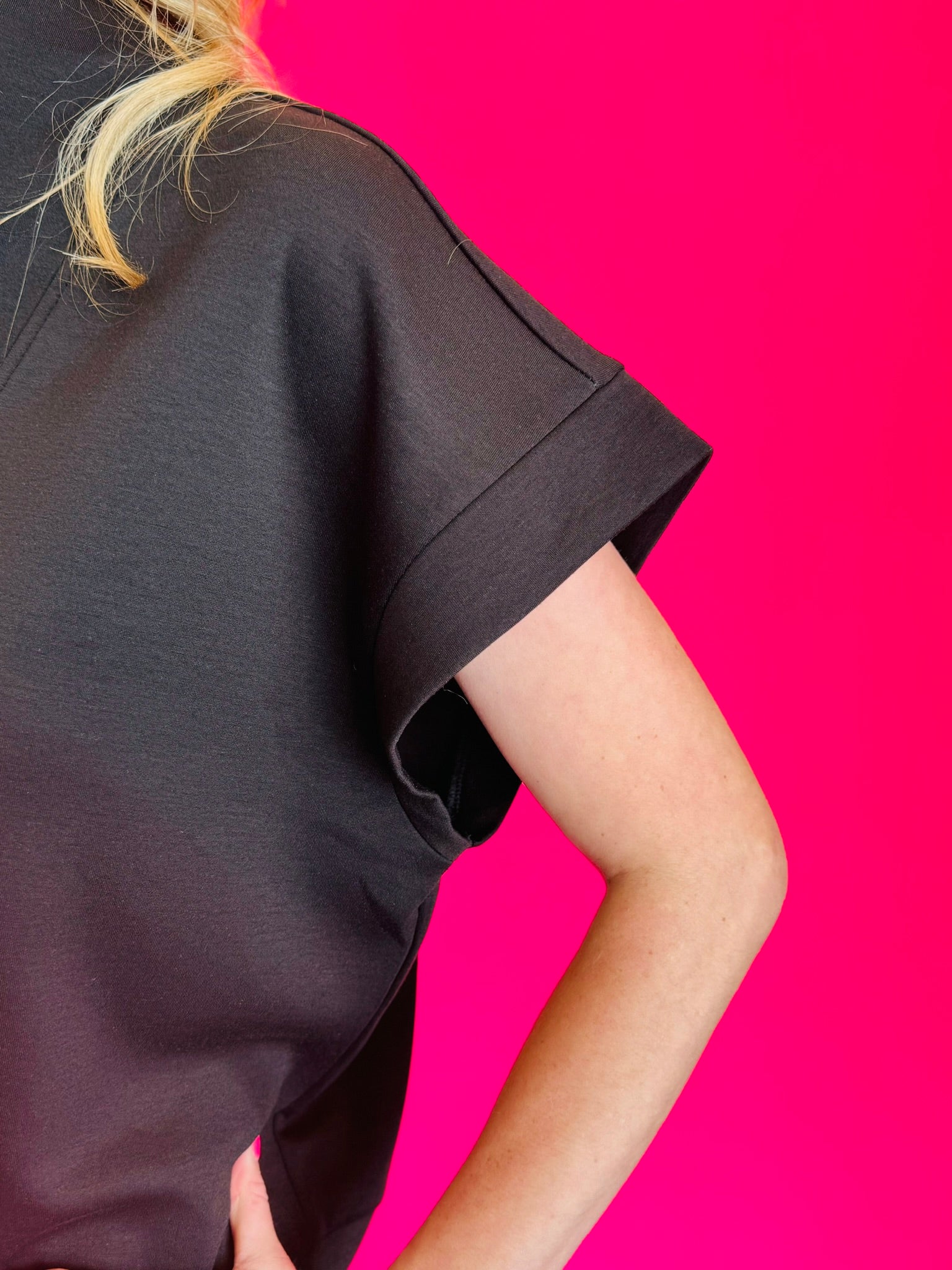 Elevate your basics with this Black Scuba High Neck Half Zip Top—an essential piece that blends comfort, versatility, and modern edge. Crafted from an ultra-soft scuba knit, this top features a flattering high neckline and a functional half-zip closure, adding just the right amount of detail to a timeless silhouette. Whether you're layering it under a jacket or pairing it with your favorite joggers or jeans, this sleek top transitions effortlessly from lounge to street.