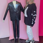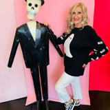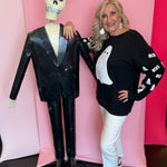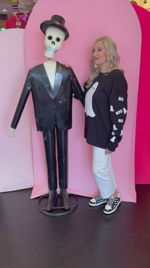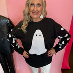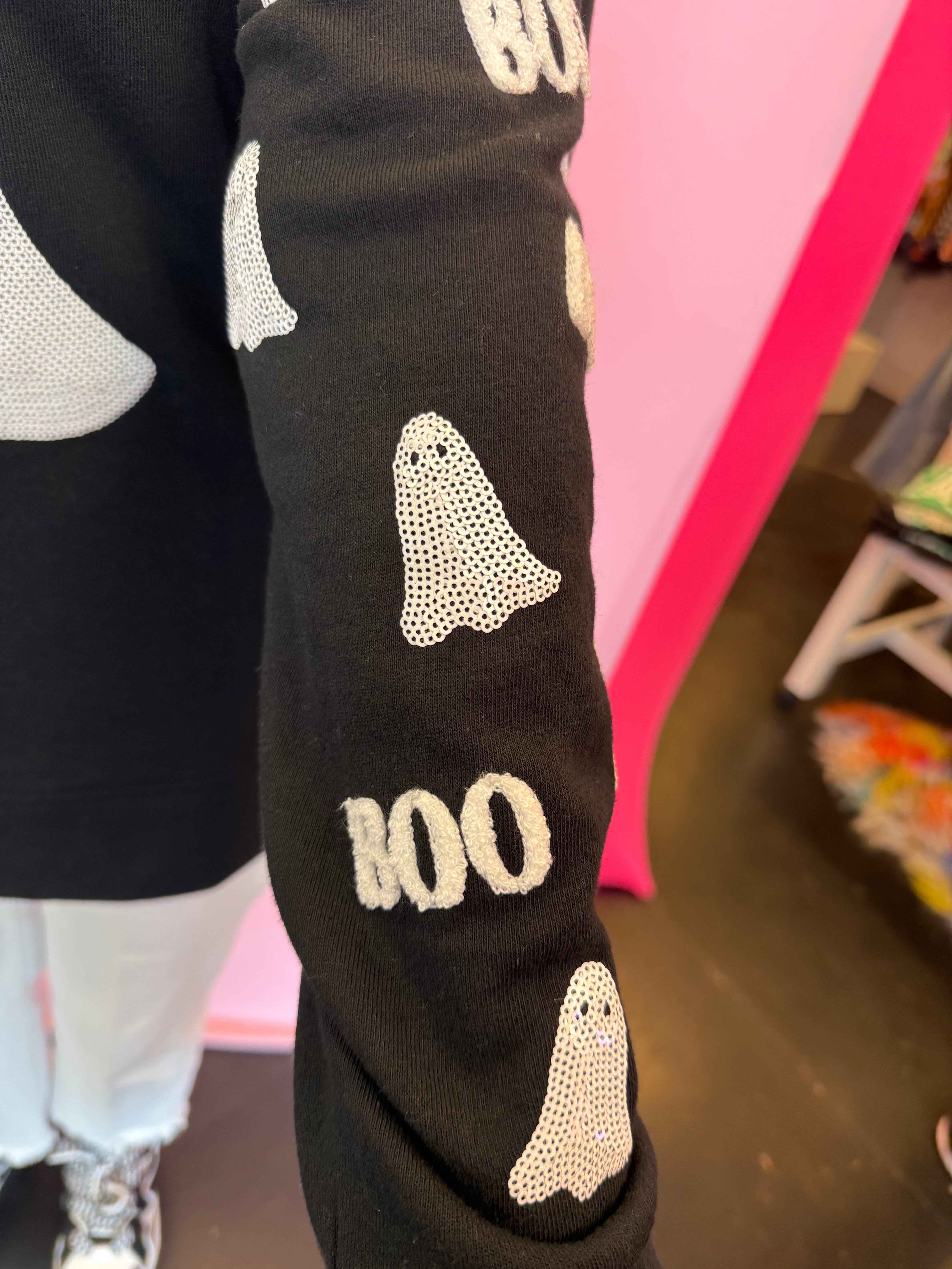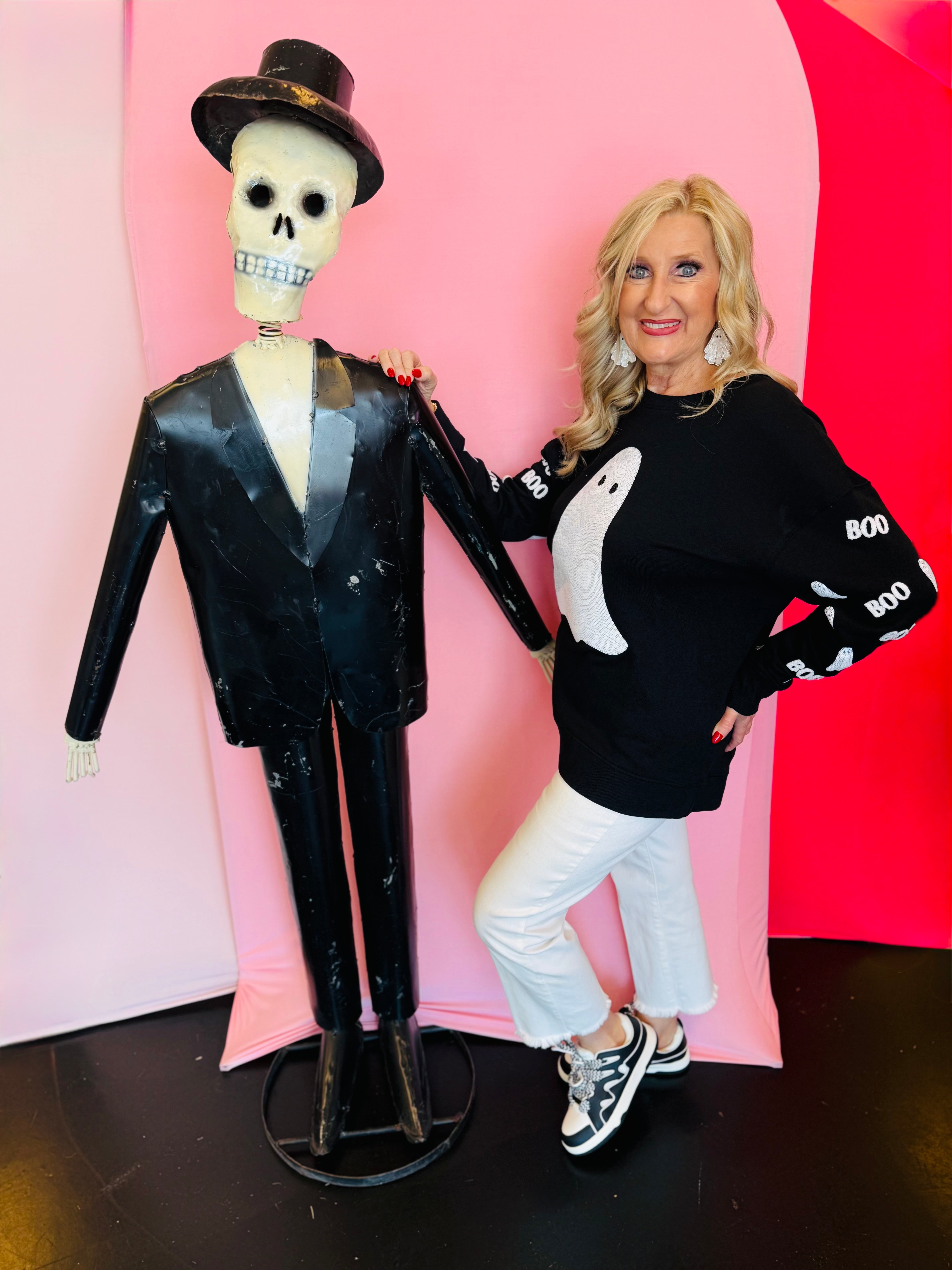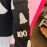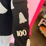 Get ready for spooky season with the Black Boo Sweatshirt, your new go-to for festive comfort. This classic black crewneck is perfect for chilly autumn nights. It features a bold, friendly white ghost graphic on the front, while each sleeve is decorated with "BOO" spelled out using more adorable ghost details. It is a stylish and spirited piece that's perfect for pumpkin patch visits, Halloween parties, or simply cozying up.