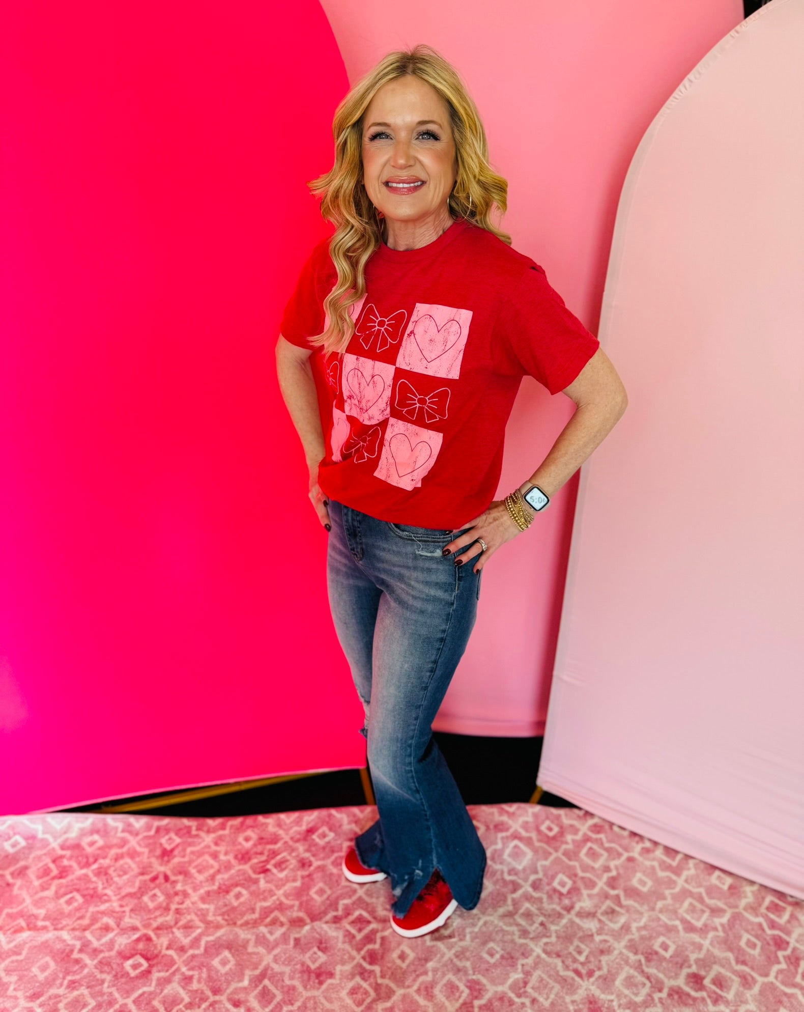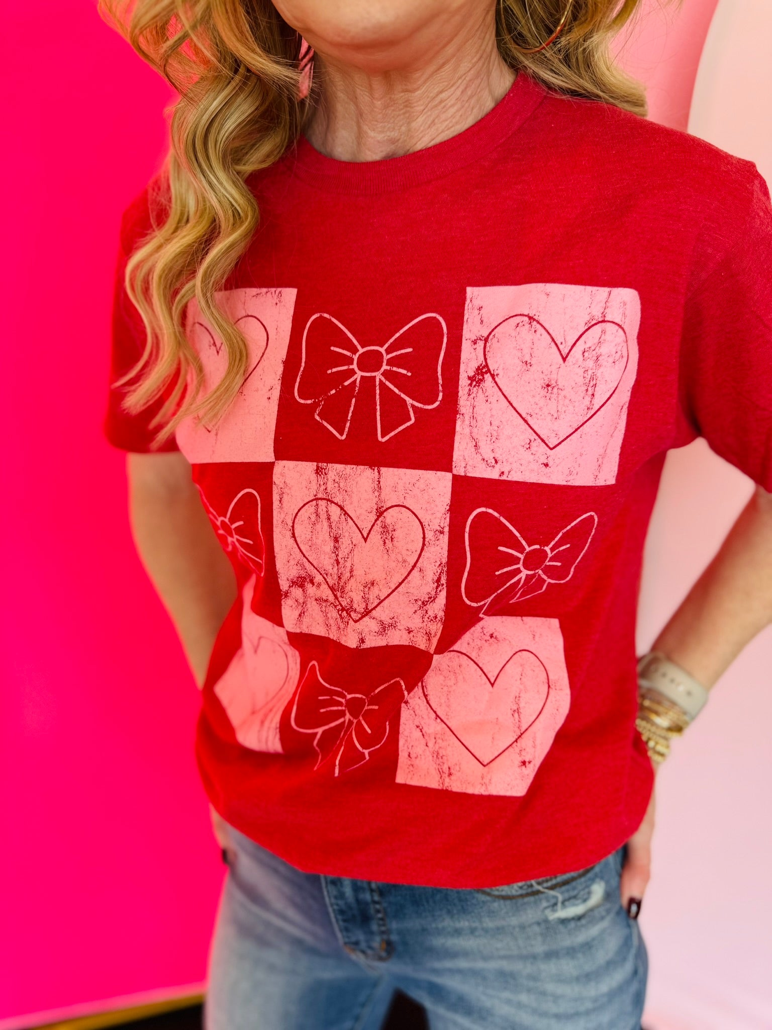 Show off your playful side with our Checkered Bows & Heart Tee, a fun and stylish addition to your casual wardrobe. Designed in a bold red base, this tee features a lively pattern of pink and red checks, perfectly accented with whimsical bows and sweet heart details. It’s the ultimate blend of charm and comfort, making it ideal for everyday wear or special occasions where you want to stand out. Crafted from soft, breathable fabric, this tee offers all-day comfort while showcasing personality and flair. Pair it with jeans, shorts, or a skirt to create versatile outfits that radiate confidence and fun.