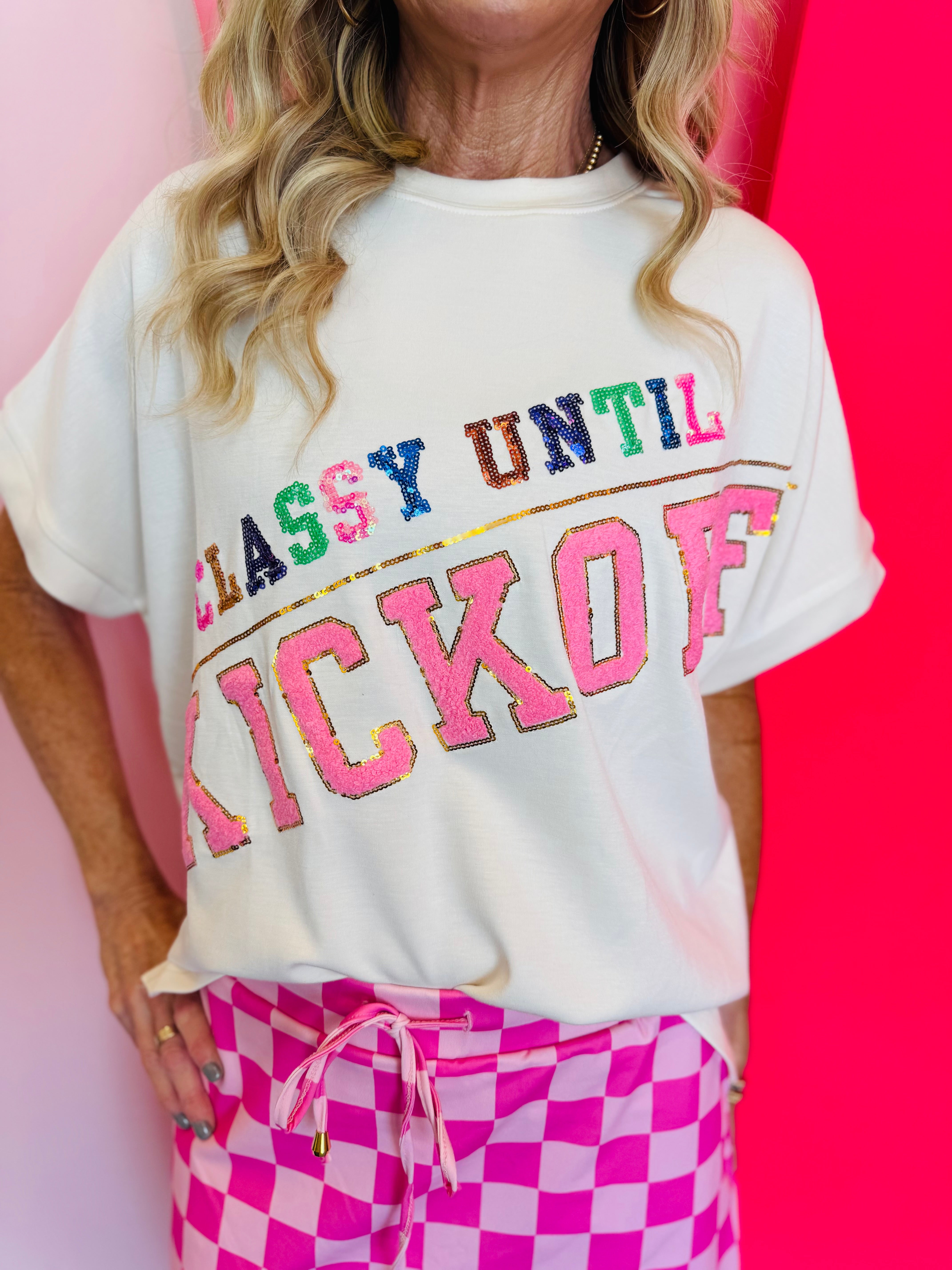 Shine bright and cheer in style with the Classy Until Kickoff Luxe Top, your new game day favorite. Designed for comfort and sparkle, this top features soft chenille and glittering sequin lettering that makes your team spirit impossible to miss. The trendy “mom crop” length hits just right—flattering while keeping your look playful and easy to style with high-waisted jeans, leggings, or skirts. Crafted from our premium LUXE fabric blend of 55% rayon, 40% polyester, and 5% spandex, it’s soft, stretchy, and comfortable for all-day wear. Whether you’re tailgating, cheering in the stands, or celebrating post-game, this top keeps you looking fabulous from kickoff to the final whistle.