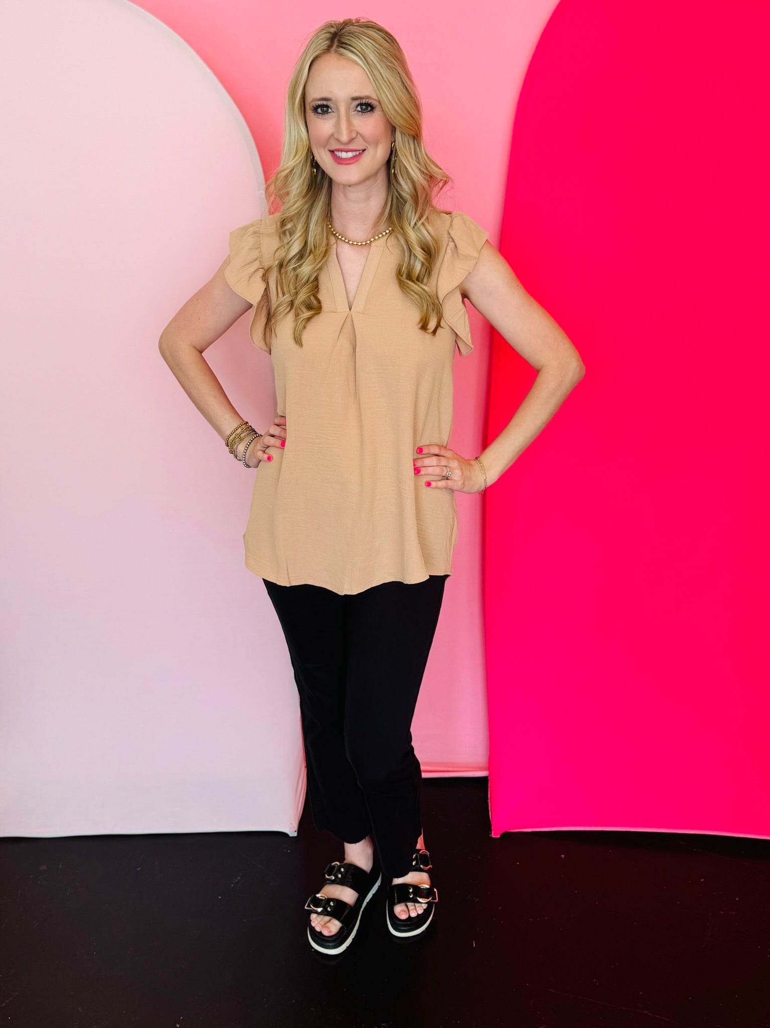 Upgrade your wardrobe with our Light Mocha High Low Top! Stay cool and stylish with the woven airflow material and ruffled sleeves. The high-low hem adds a trendy touch to this must-have piece. Don't miss out on the perfect blend of fashion and comfort.