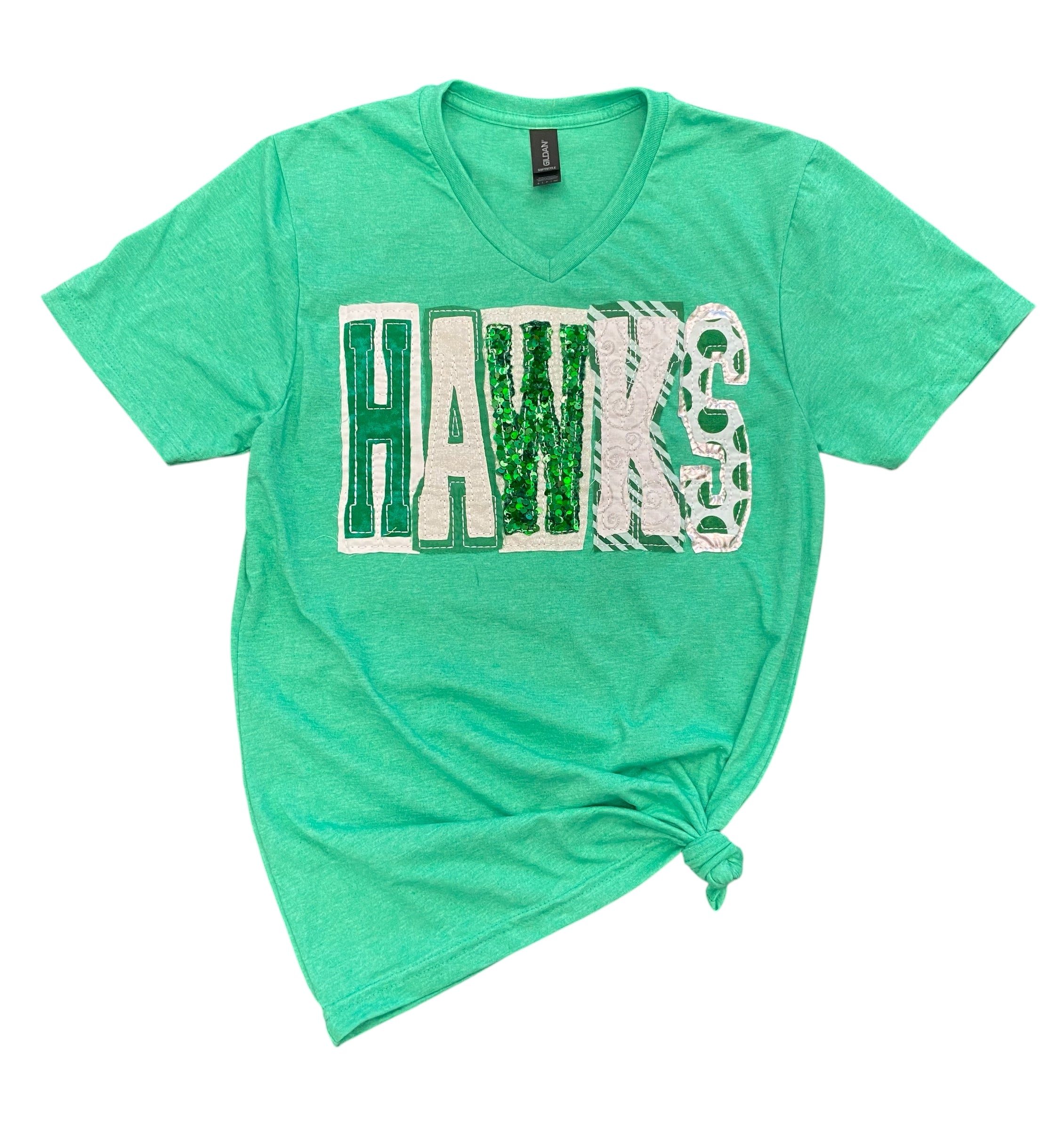 Support the Iowa Park Hawks in ultimate comfort and style with this green Gildan Softstyle V-Neck Tee! This premium t-shirt is the perfect fan apparel for game day and beyond. Crafted from 100% preshrunk ring-spun cotton, it offers a soft, lightweight feel that keeps you comfortable all day. The eye-catching double-layered game day motif is brought to life with a beautiful, multicolored green and white fabric appliqué, providing a unique textured look that won't fade or crack. Represent your team with a high-quality, durable design that shows off your Hawks pride.