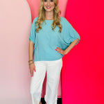 Introducing our Dusty Teal Oversized Boxy Top - the perfect piece for adding a touch of whimsy to any outfit. Made with a durable woven fabric, this top boasts an oversized and boxy fit for a comfortable yet stylish look. Upgrade your wardrobe with this unique piece now!