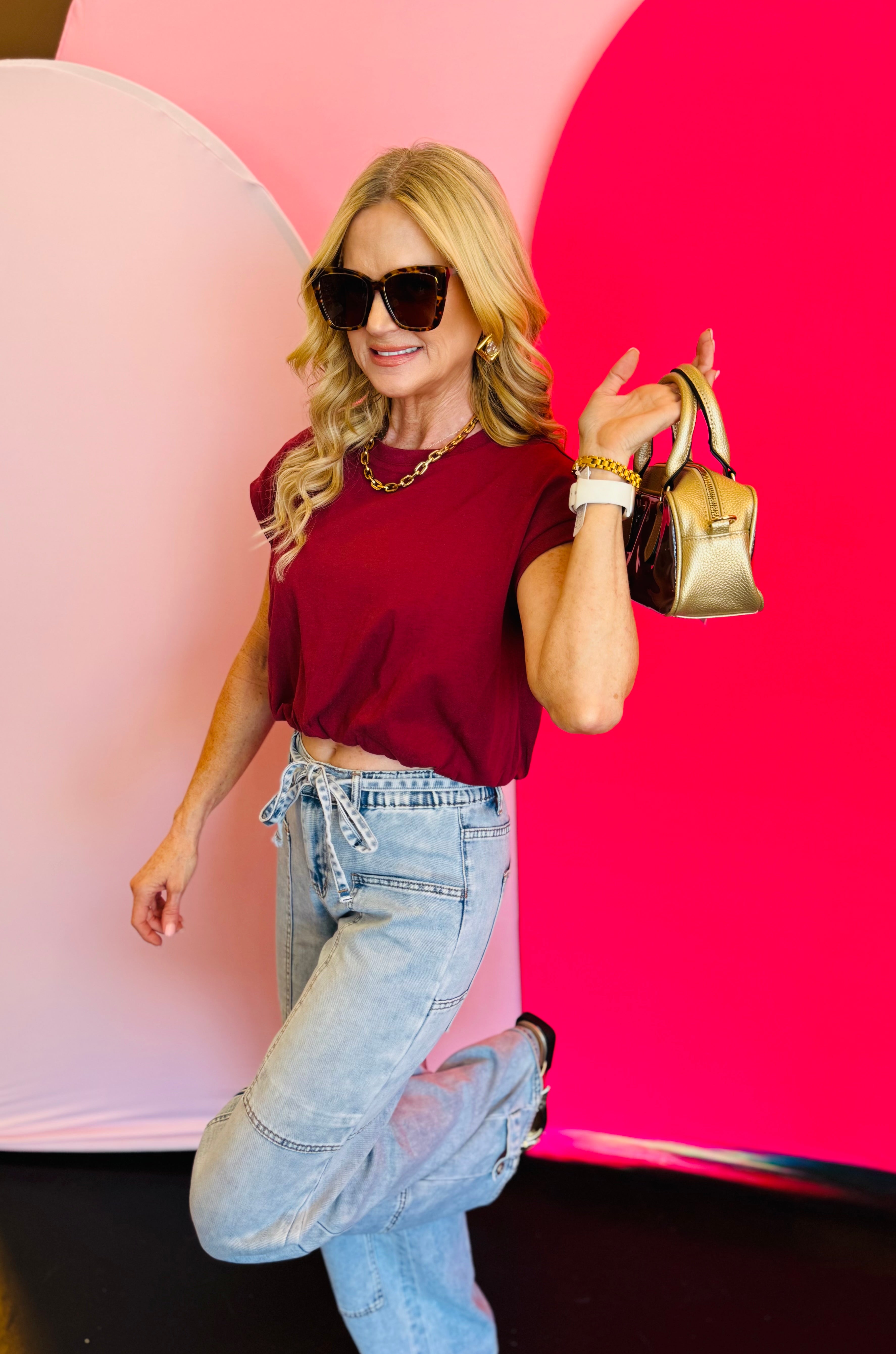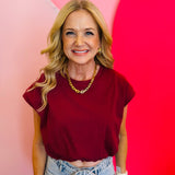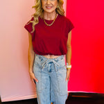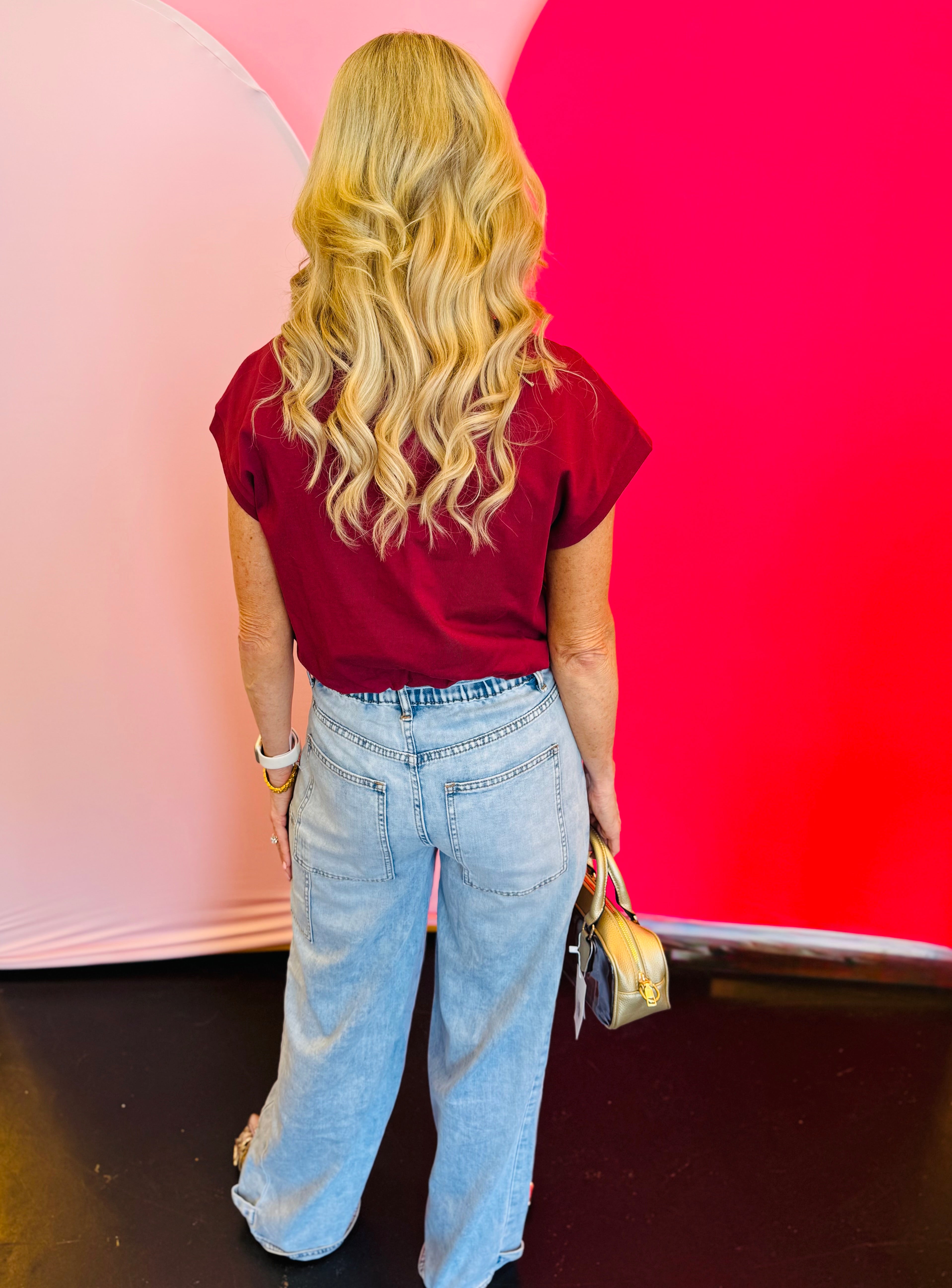 Experience effortless style and comfort with the Emma Burgundy Bubble Hem Top! Designed with a soft bubble hemline and gentle elastic, this top offers a flattering, relaxed fit that moves with you. The rich burgundy color adds a bold yet versatile pop to your wardrobe, making it a standout choice for Game Day or everyday wear. Made from 100% cotton, it’s breathable, lightweight, and perfect for all-day comfort. Capped short sleeves bring a sporty edge while keeping it easy to layer or wear solo. Whether you're in the stands or out on the town, this top keeps you confident, cute, and comfortable.