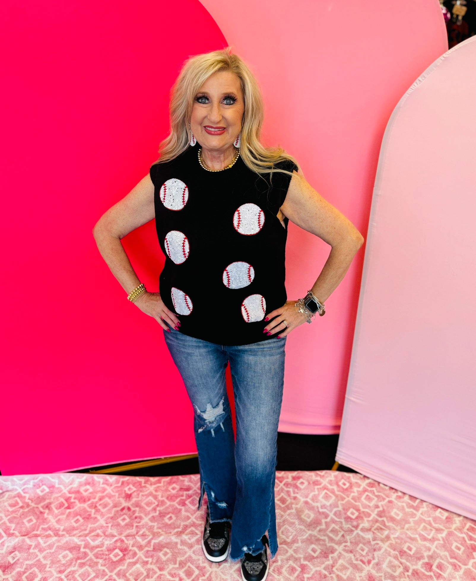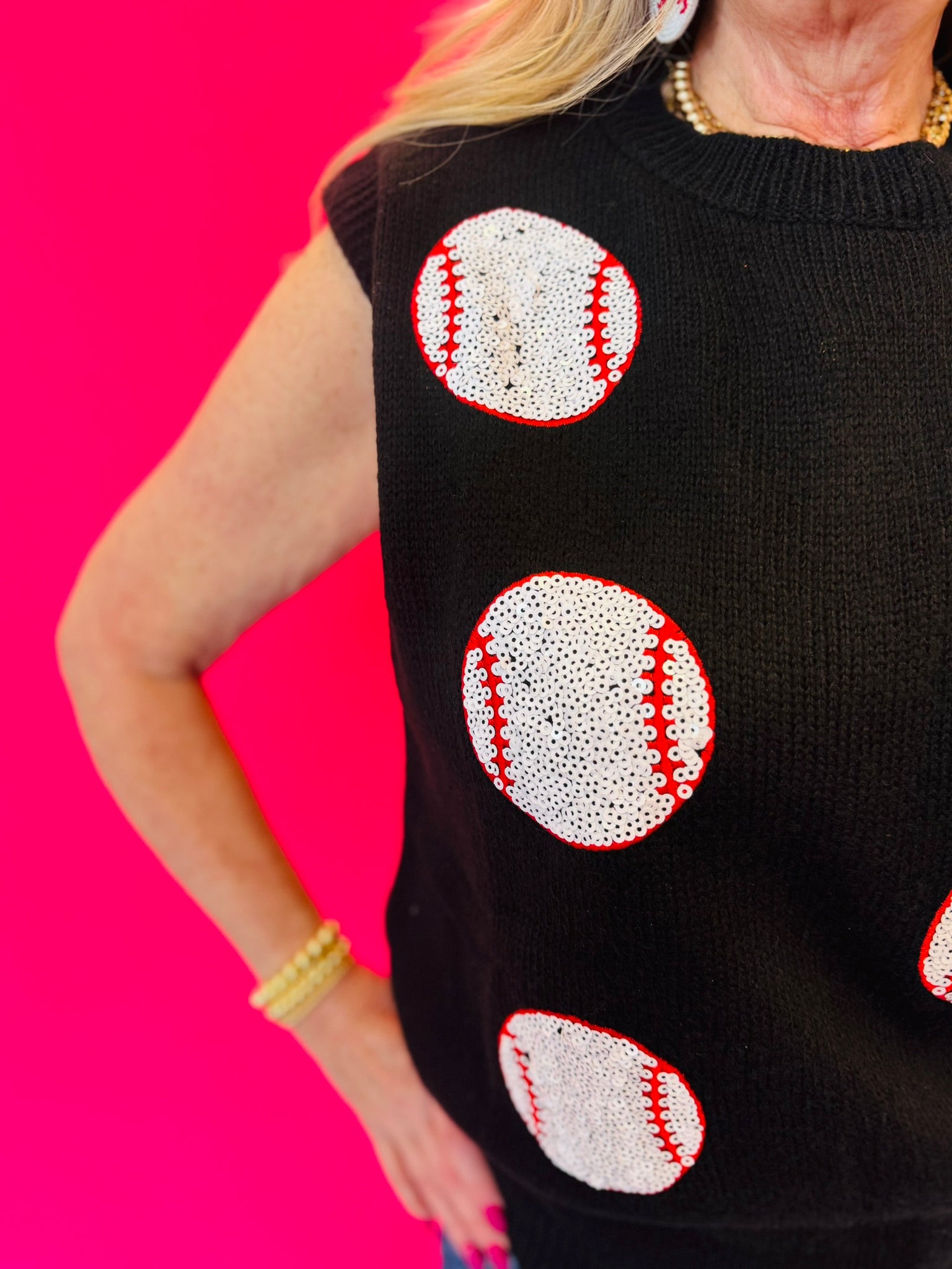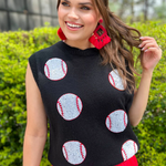 Introducing the ultimate statement piece for the fashion-savvy baseball fan: the Had Me At Baseball Sweater Vest. Crafted in sleek black with shimmering sequin baseballs, this luxury vest captures the essence of the game while elevating your style to new heights. A must-have for any fashion-forward wardrobe.