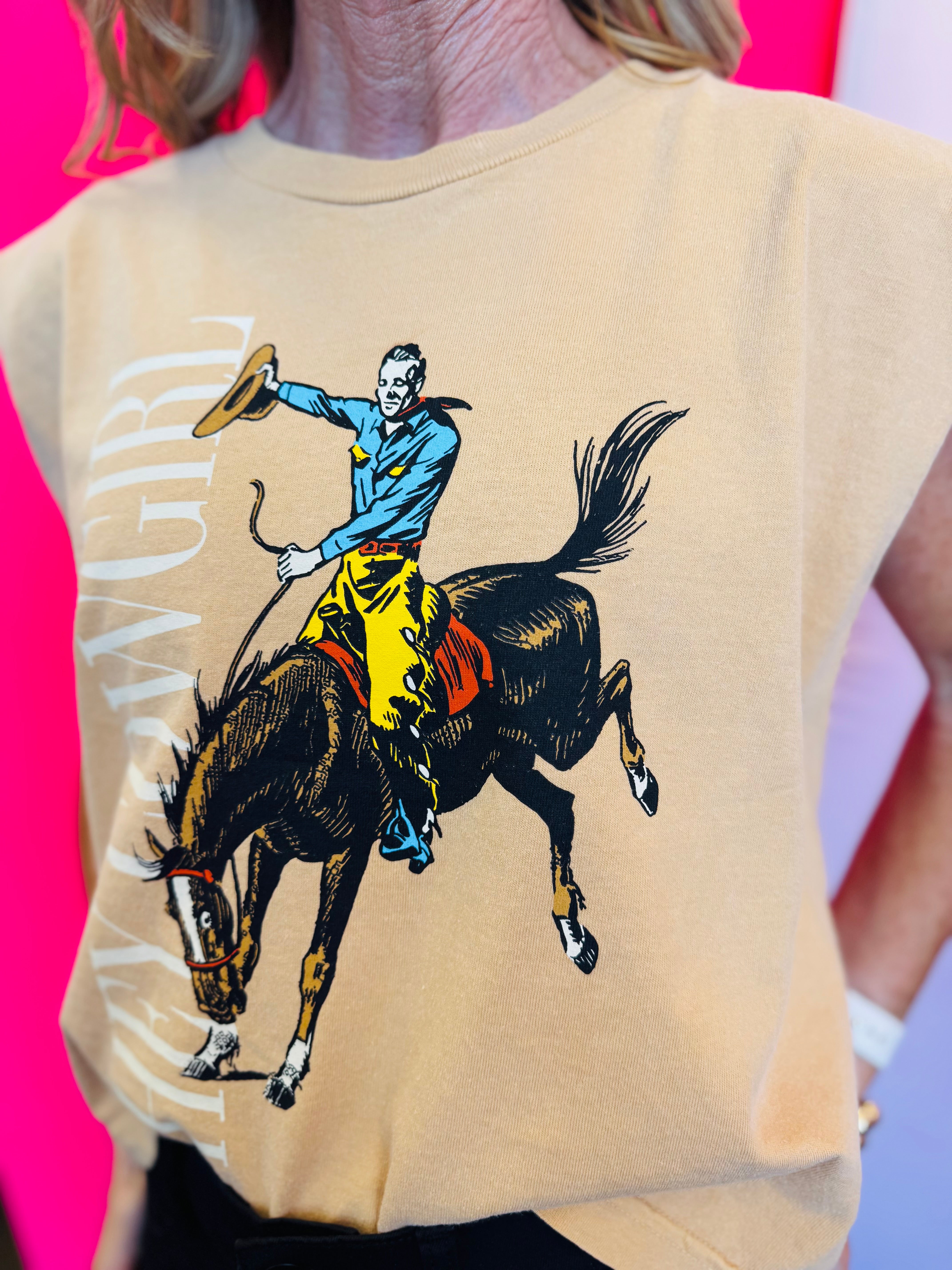 Take a ride on the wild side with our Hey Cowgirl Cap Sleeve Tee! Show off your daring spirit with a wheat colored cap sleeve tee and cowboy graphics that exude confidence and adventure. Get ready to lasso in some compliments with this bold and empowering wardrobe staple. Layer with our new collared leopard mesh top for an adorable look!