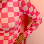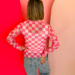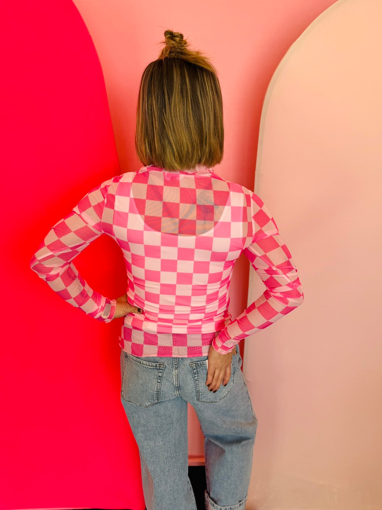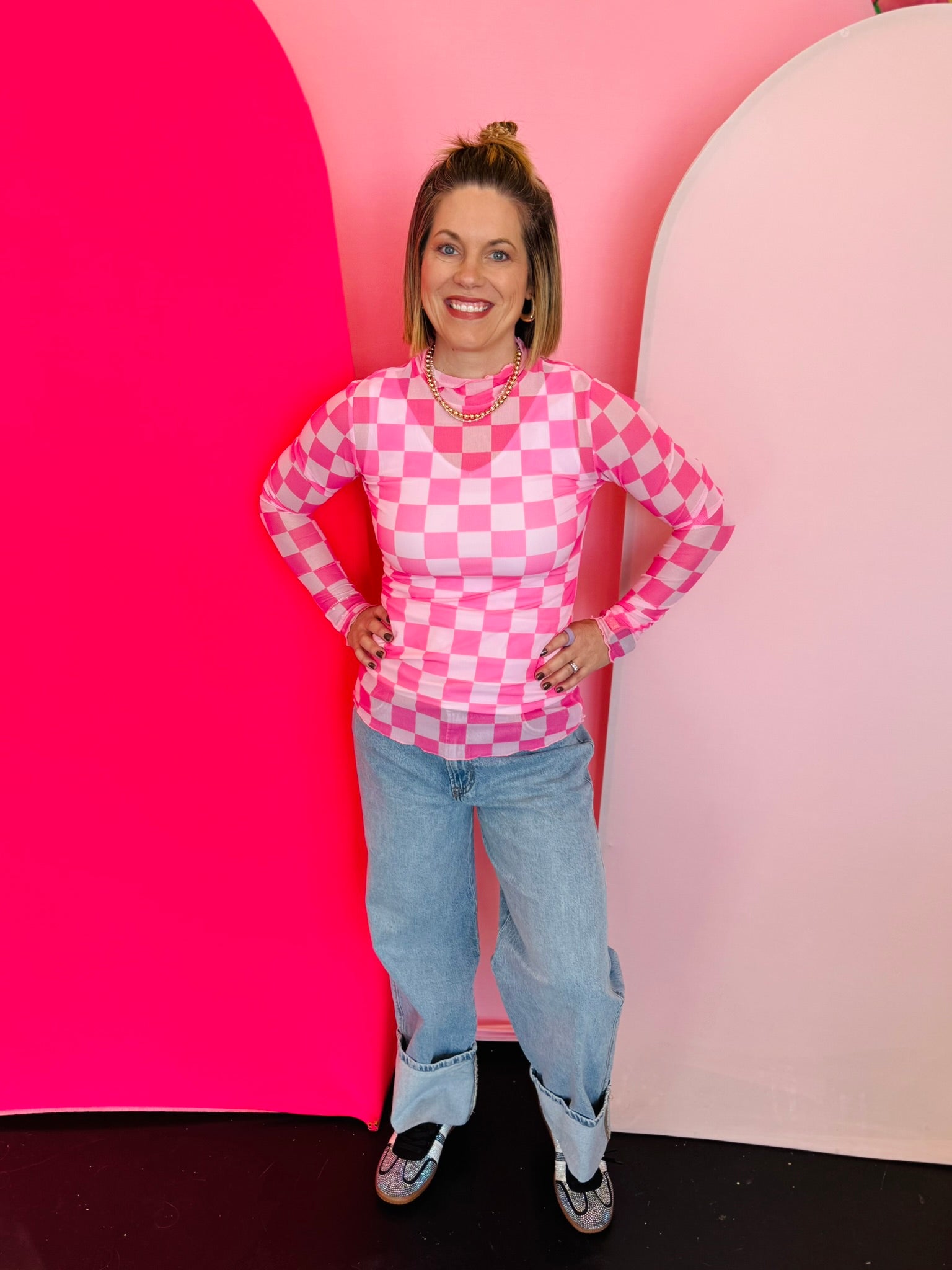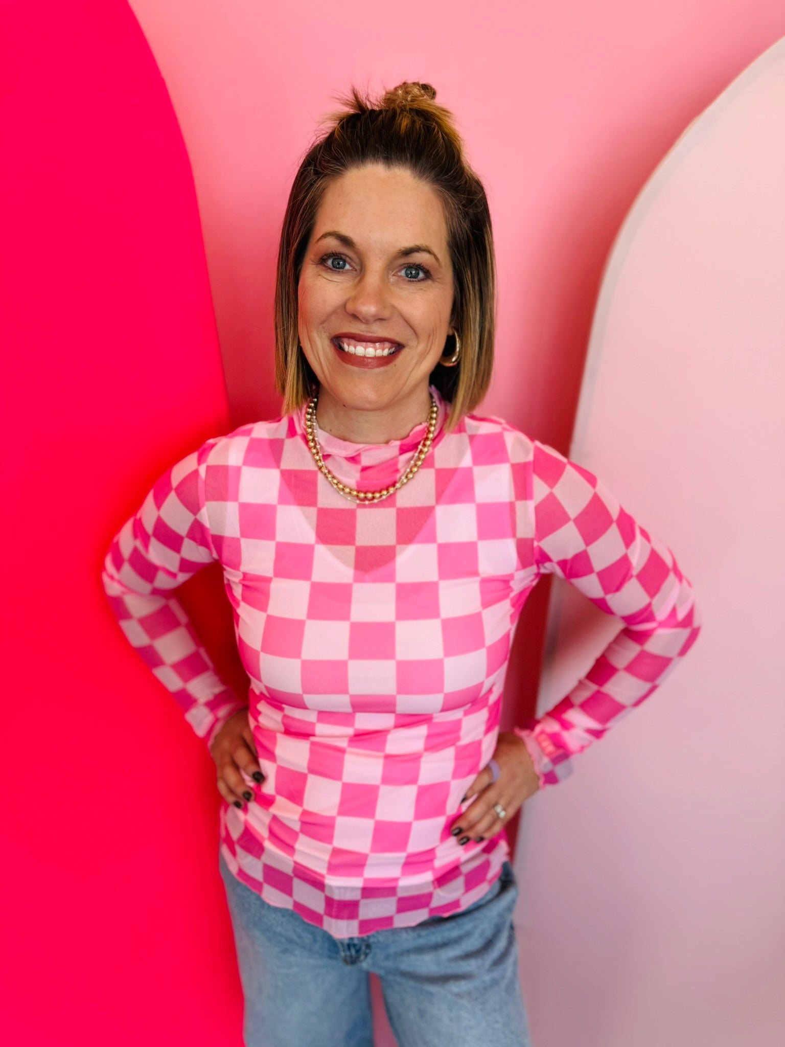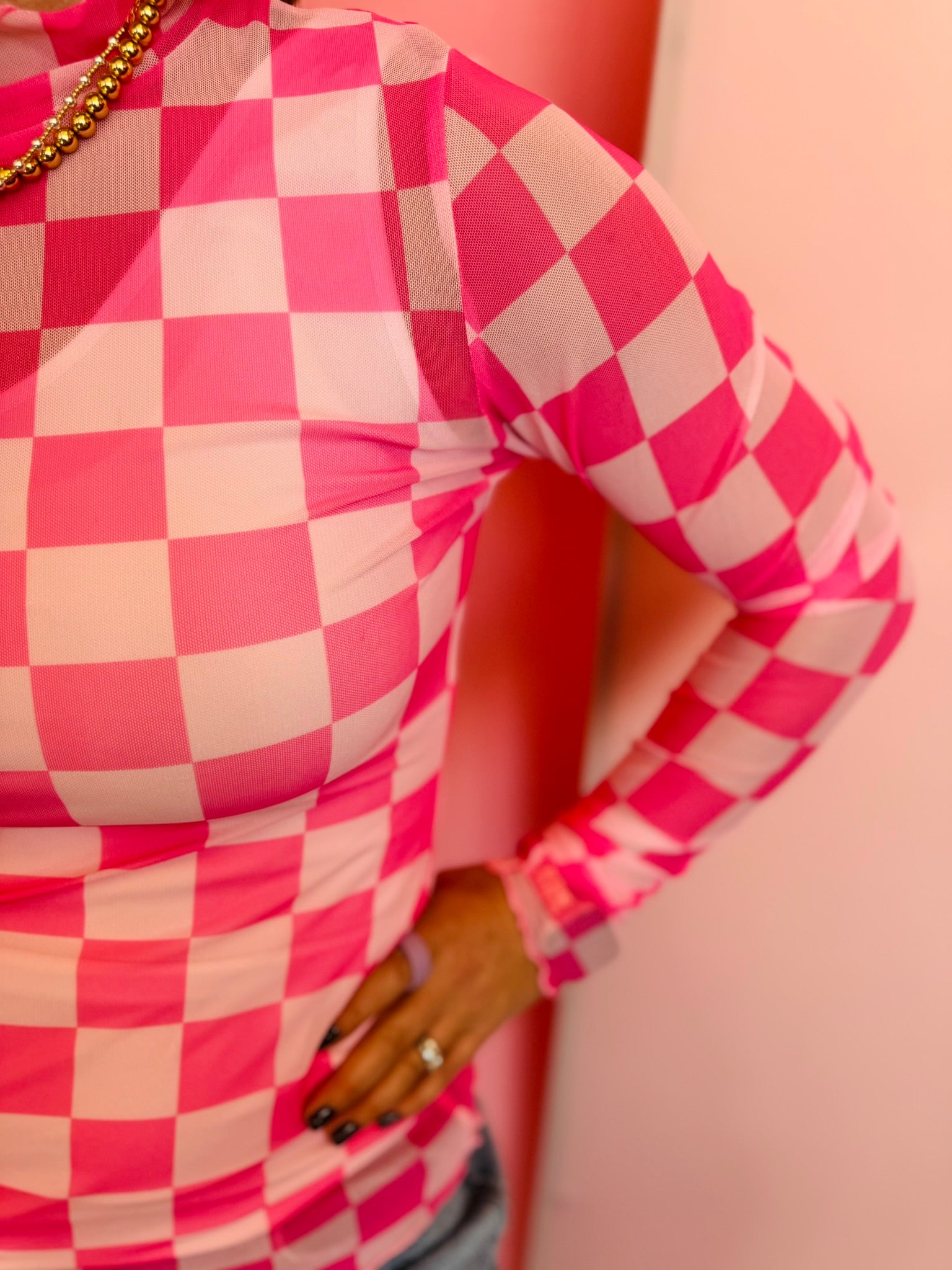 Bring playful personality and bold style to your wardrobe with our Keigan Bubblegum Checkered Mesh Top, a must-have layering piece for trend lovers. This sheer mesh long sleeve top features a vibrant bubblegum-pink checkered print that instantly adds fun, Y2K-inspired flair to any outfit. Designed with a chic mock neckline and delicate lettuce hems, it offers both softness and stretch thanks to its 95% rayon, 5% spandex blend. Wear it under graphic tees, over bralettes, layered beneath sweaters, or paired with denim and skirts for a fashion-forward look that transitions effortlessly from daytime casual to nighttime cool. Lightweight, breathable, and endlessly versatile, the Keigan Mesh Top is the statement layer your closet has been waiting for.