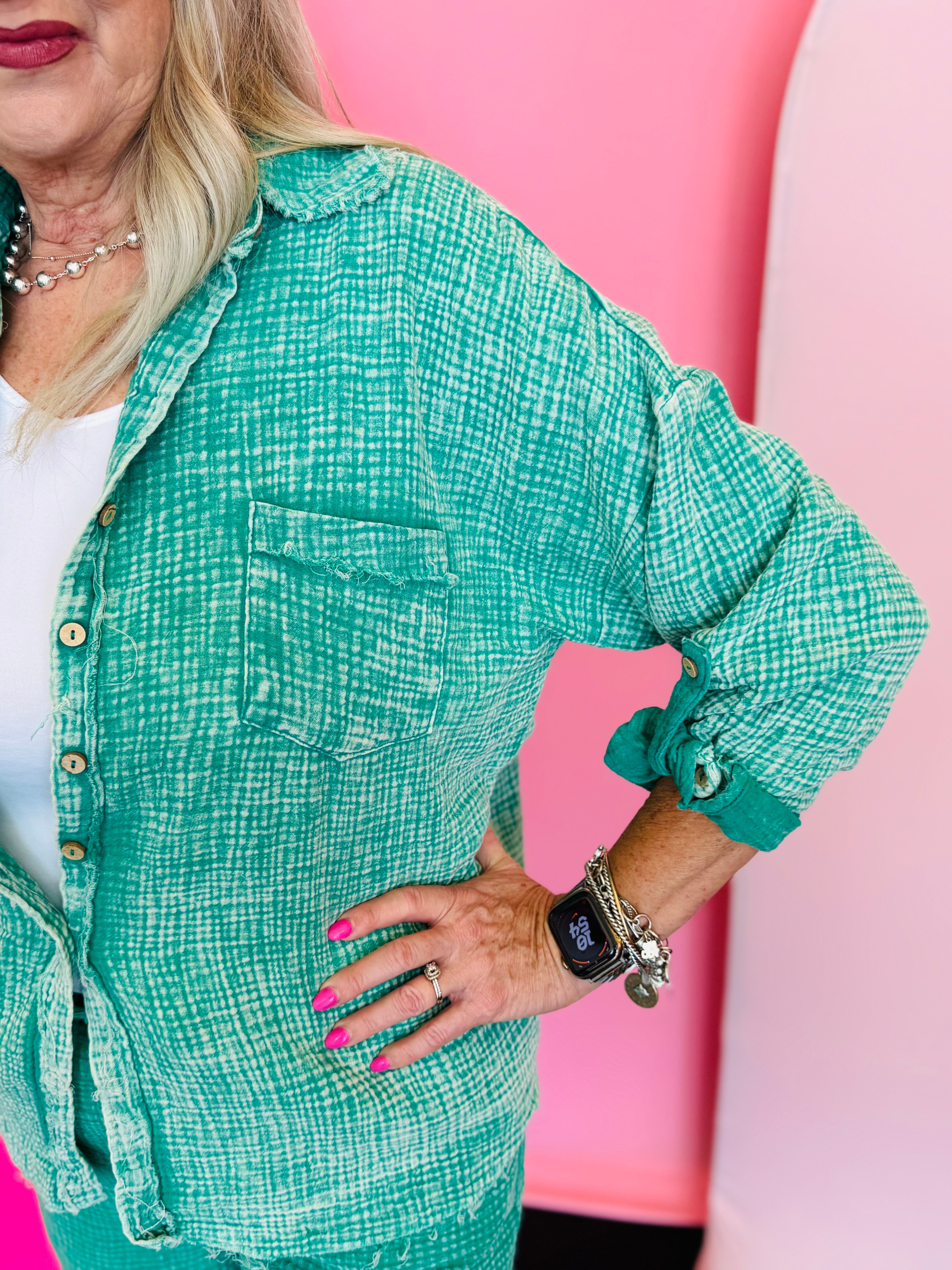 Elevate your wardrobe with our Kelly Green Button Down Shirt. Made from a soft and breathable washed double gauze, this shirt features a classic button-down style, roll-up long sleeves, and a convenient front pocket. The back patch adds a touch of unique flair. Perfect for any occasion!