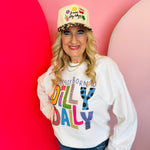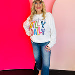 White sweatshirt with colorful mixed-pattern “Literally Born to Dilly Dally” lettering