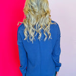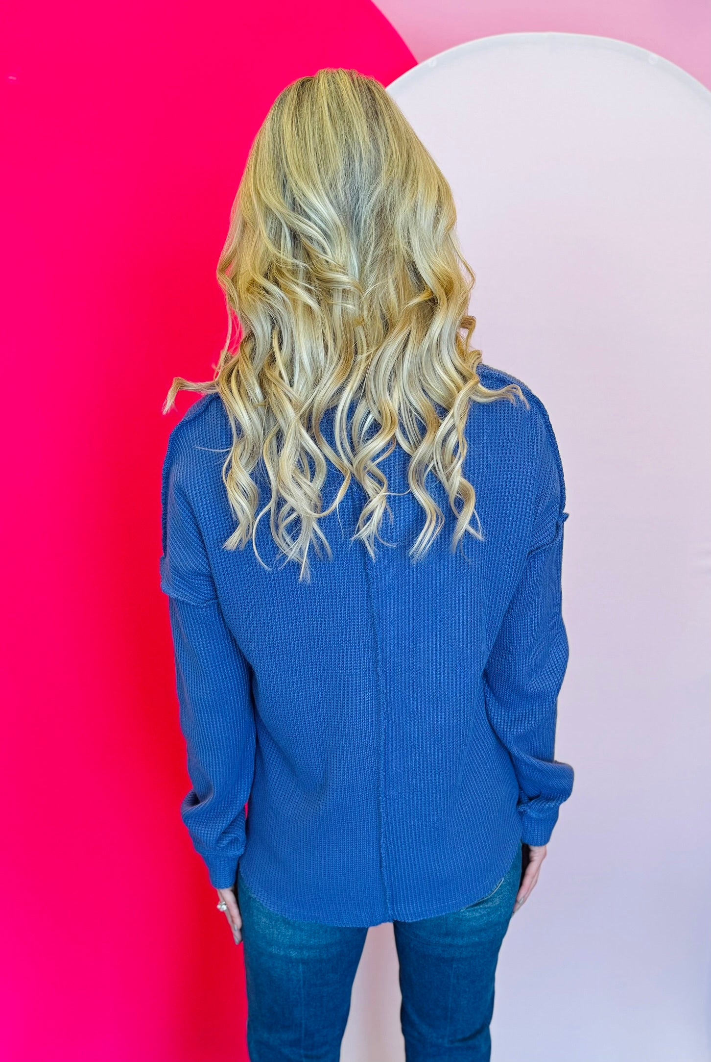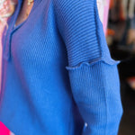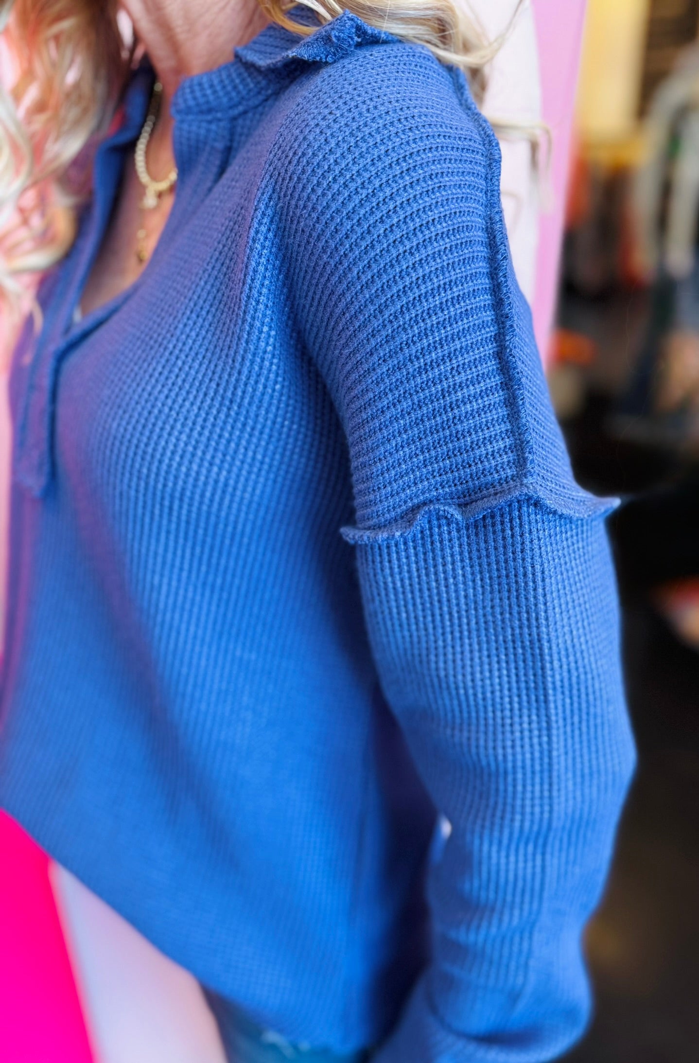 Refresh your wardrobe with the effortless charm of the Marlin Pullover Top. This piece features a flattering V-neck and a sleek collar in a gorgeous marlin blue. Its easy pullover design and trendy raw seam details create a look that is both classic and perfectly modern. Ideal for any occasion, dress it up for the office under a blazer or down with jeans for a casual weekend. Made from soft, breathable fabric, this versatile top offers effortless sophistication, making it a closet essential you will reach for again and again.