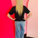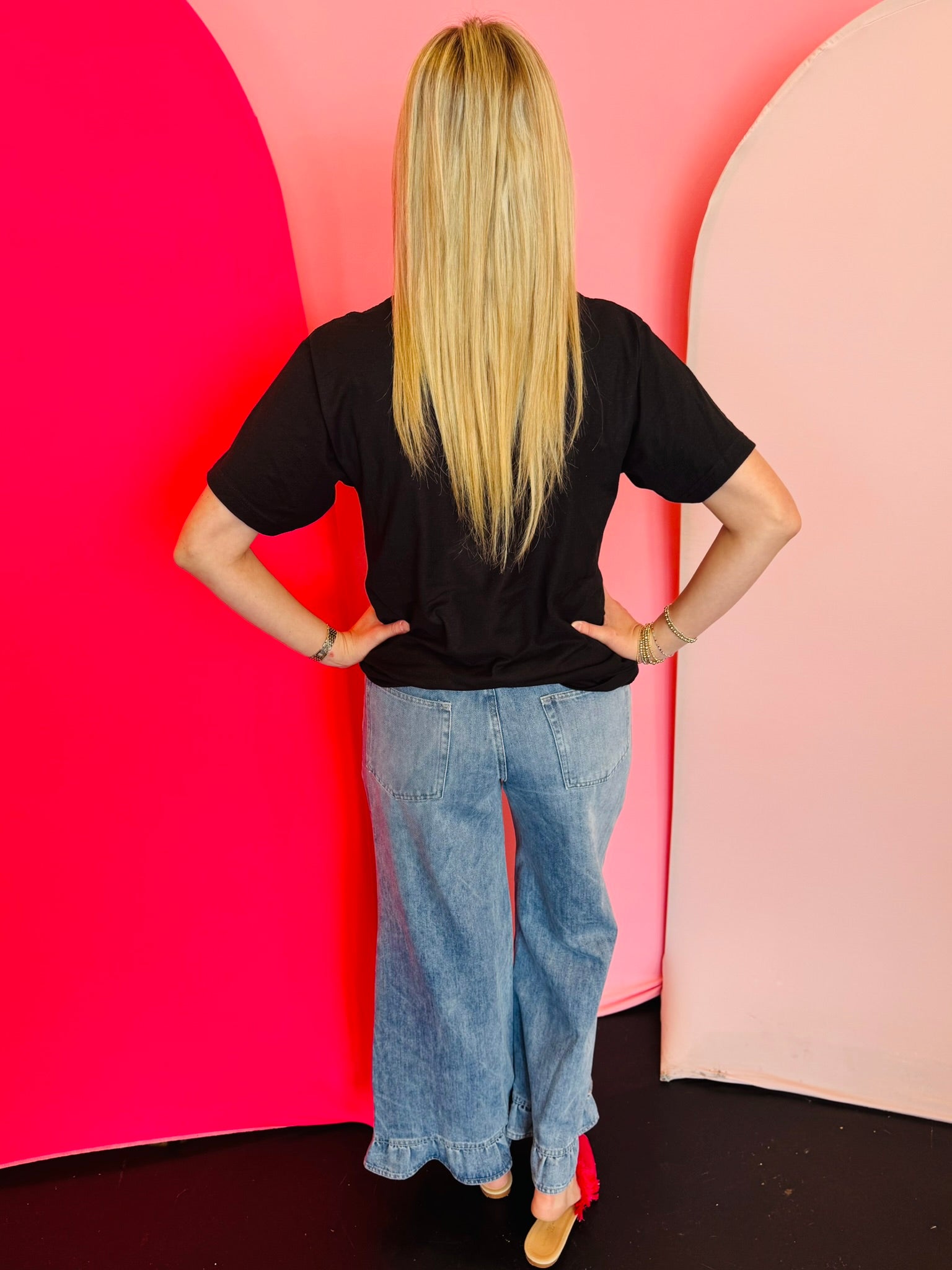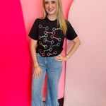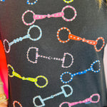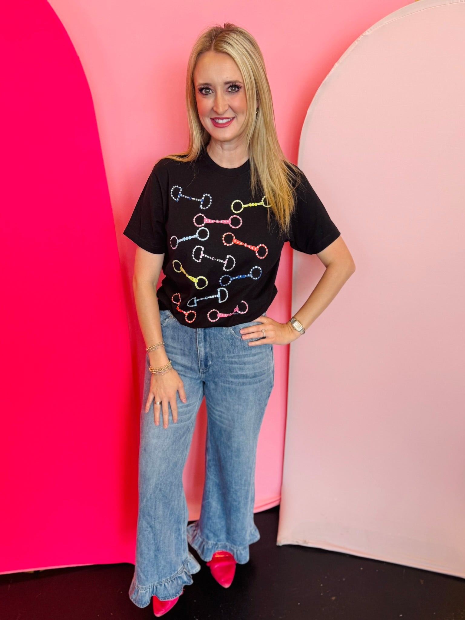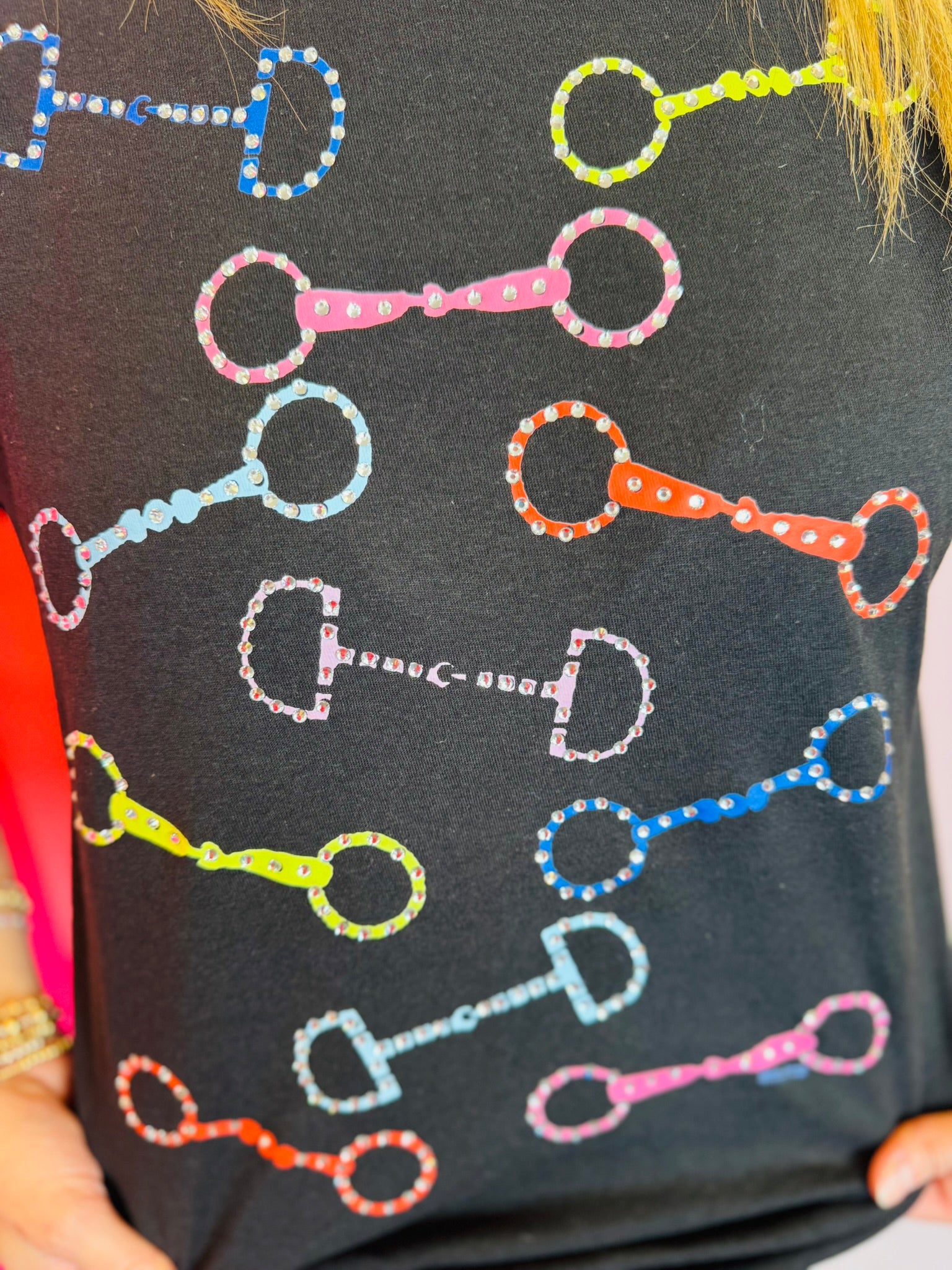Add a bold western touch to your everyday style with this Western Horse Bit Graphic Tee. Designed on a classic black base, this standout tee makes every detail pop with its all-over pattern of colorful horse bits. Each bit is uniquely styled in vibrant shades like pink, blue, yellow, red, and purple, creating a fun, eye-catching design that’s full of personality. To elevate the look even more, every horse bit is outlined in subtle sparkly rhinestones, adding just the right amount of shimmer without overpowering the design.