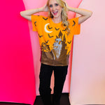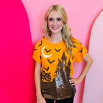 Celebrate spooky season in high-fashion style with the Queen Of Sparkles Orange & Black Halloween House Tee. Known for upscale, statement-making designs, Queen Of Sparkles delivers a festive must-have with this vibrant orange short-sleeve tee. Bold black and white sequin graphics showcase a haunted house scene complete with bats, a glowing jack-o-lantern, and a shimmering moon—perfect for Halloween parties, pumpkin patch visits, or stylish everyday wear. Crafted with premium-quality fabric, this trendy tee offers a relaxed fit that layers effortlessly under jackets or pairs with your favorite jeans and skirts.
