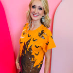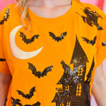 Bright orange tee with black and white sequin haunted house graphics