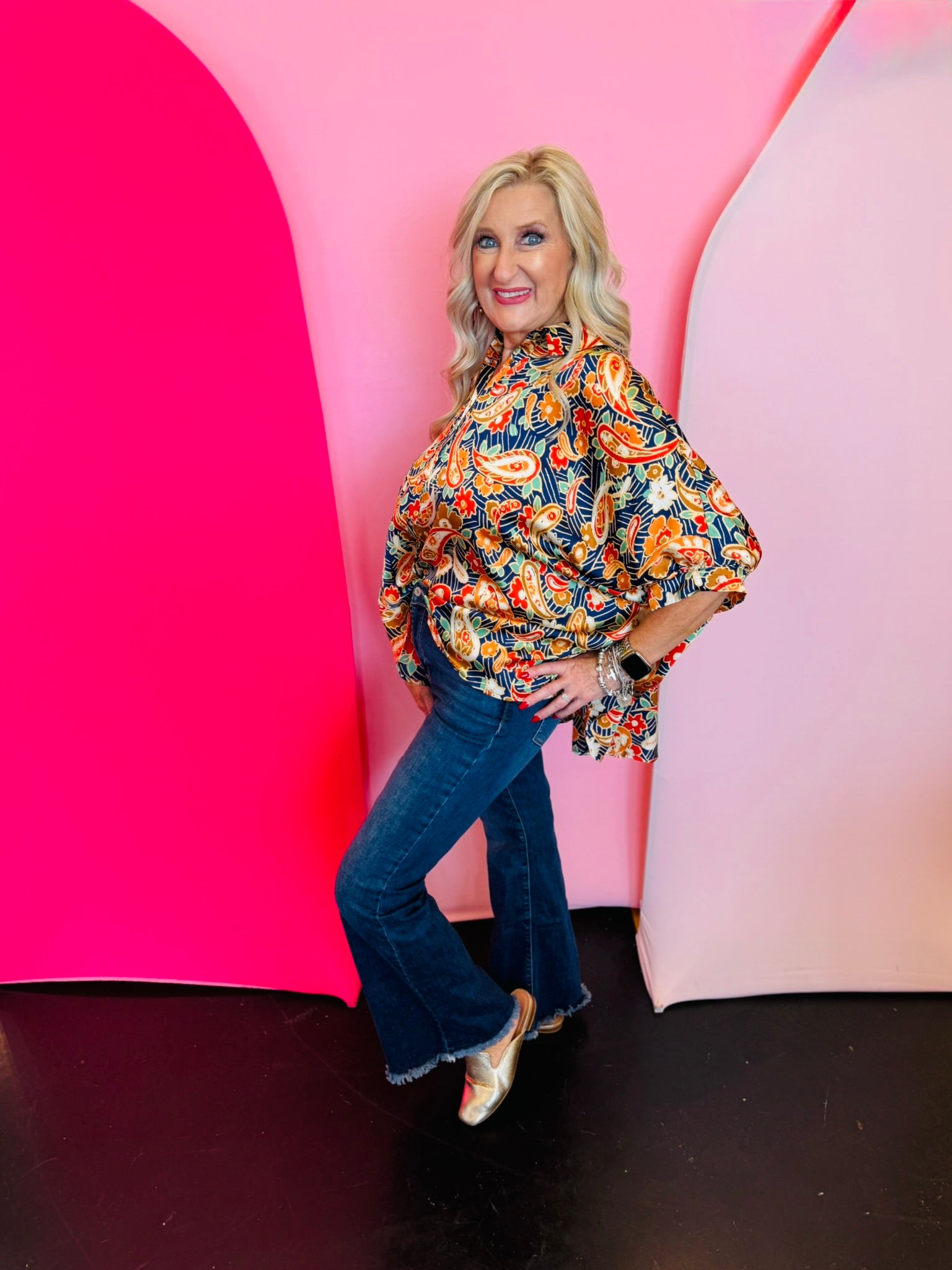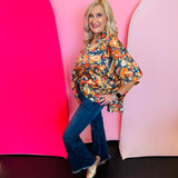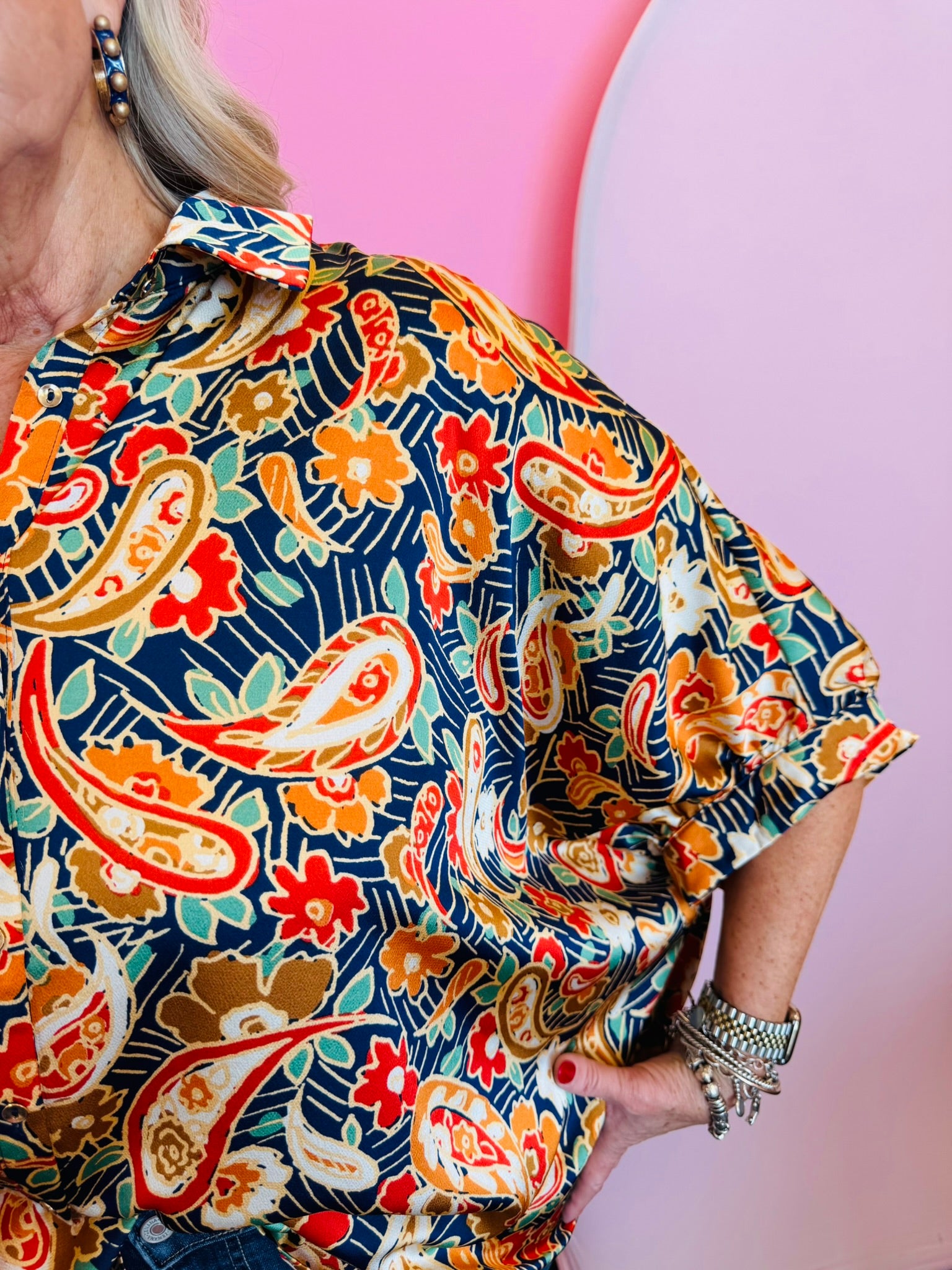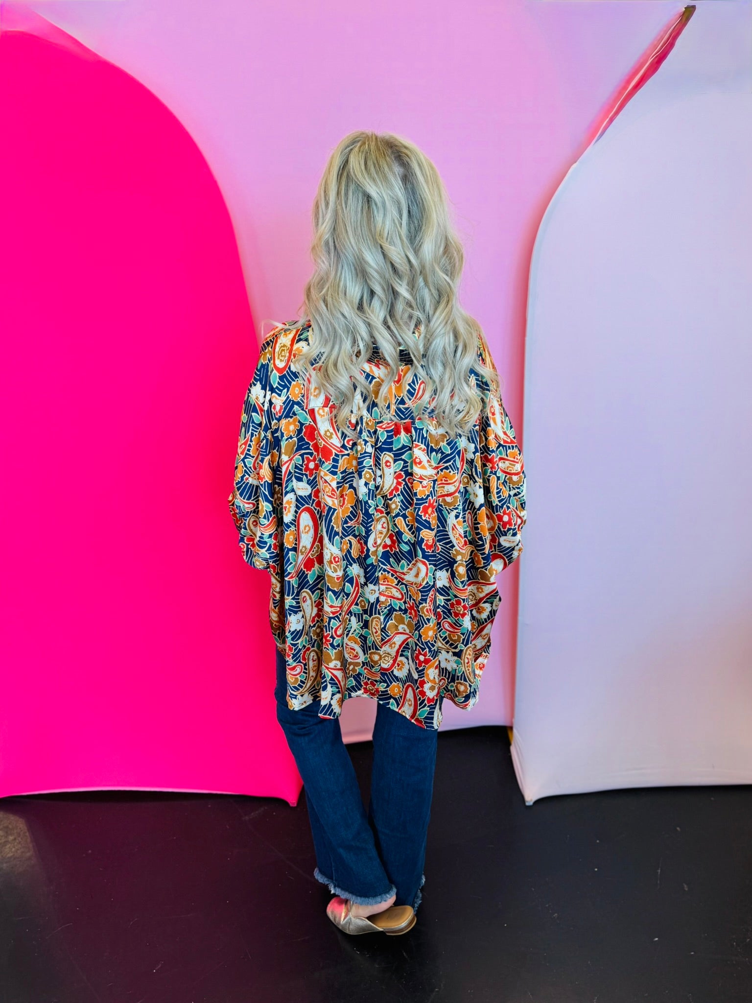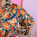 Step into effortless elegance with our Mixed Paisley and Floral Printed Top—a statement piece that blends timeless patterns with modern design. The vibrant mix of paisley and floral prints creates eye-catching dimension, while the button-down front offers versatile styling. Designed with ½ dolman sleeves, it delivers a relaxed, flattering drape that’s perfect for both work and weekends. A collared neckline lends a crisp finish, and subtle pinching in the back provides gentle shaping for a polished look. Lightweight and easy to layer, this top transitions seamlessly from day to night, making it a must-have for your year-round wardrobe. Oversized fit.
