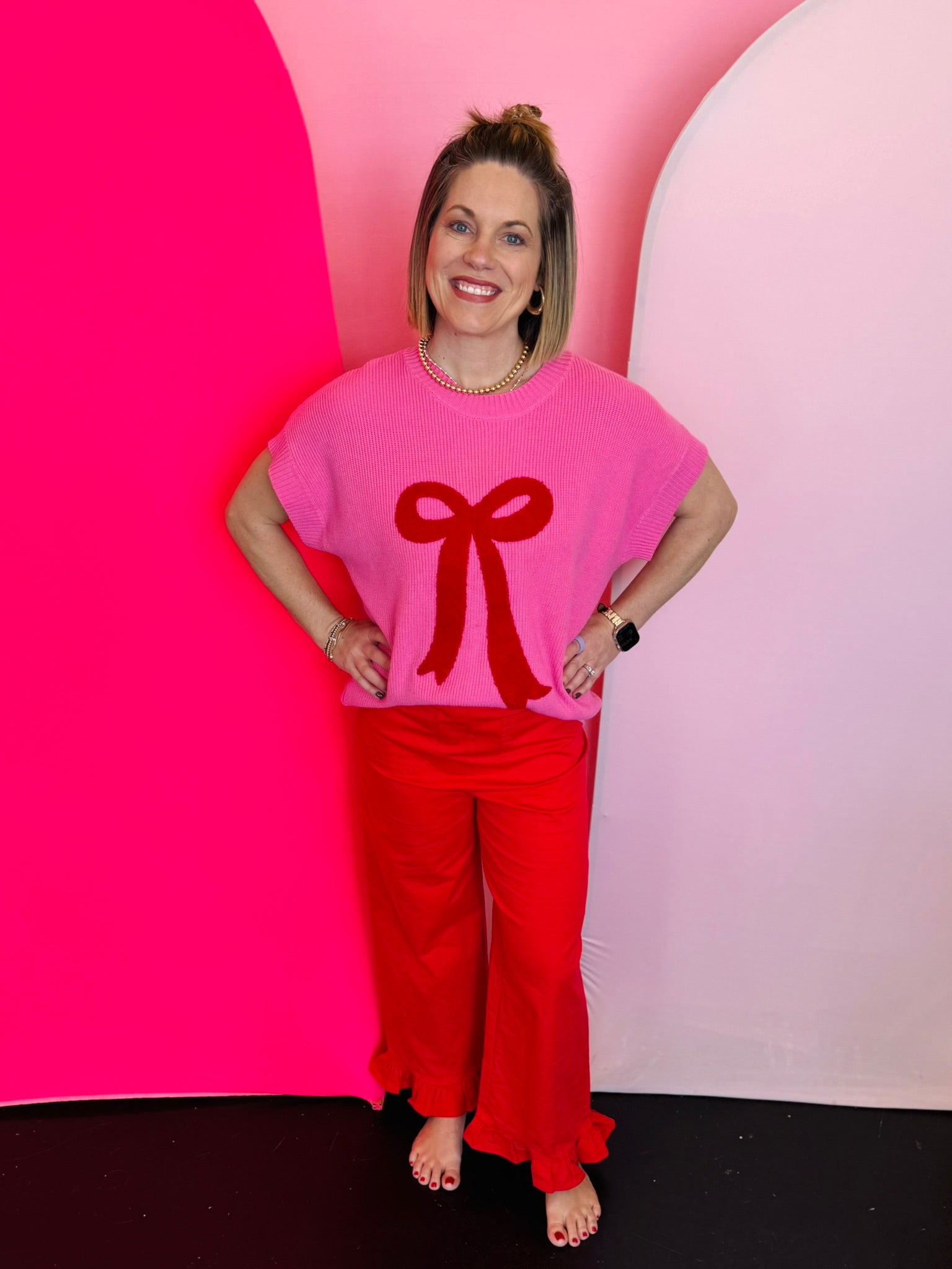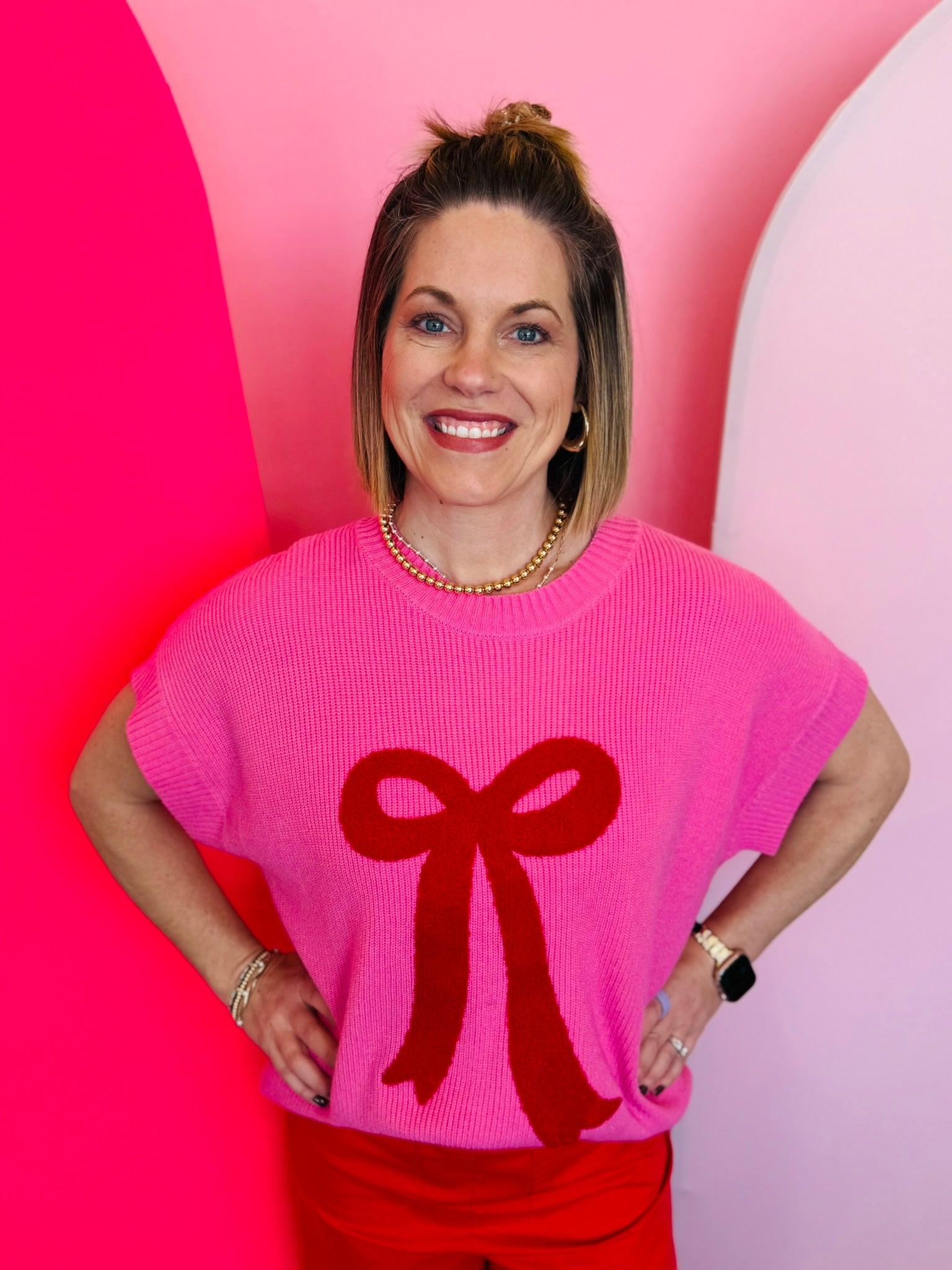 Soft pink knit with bold textured red bow