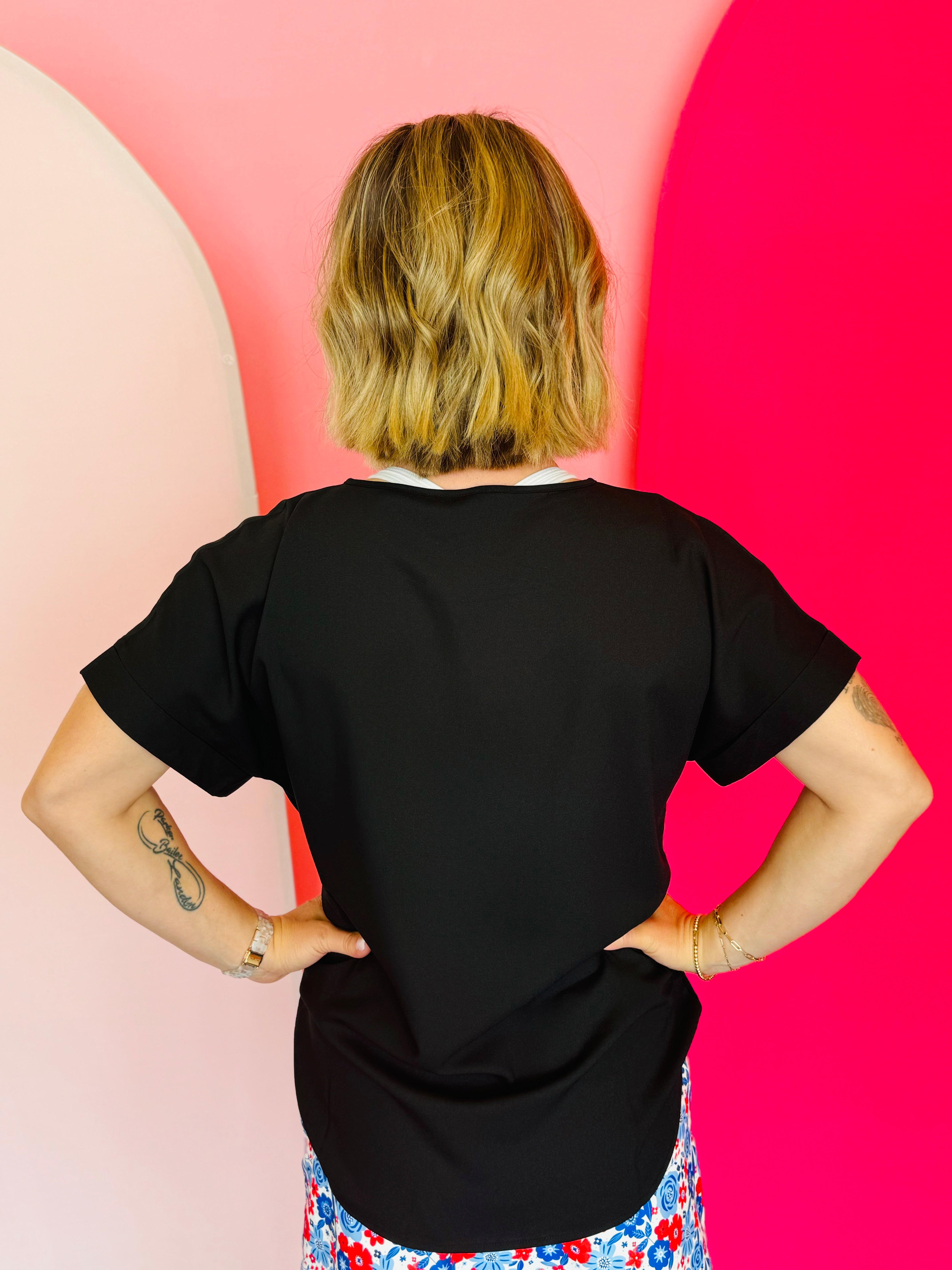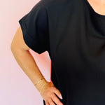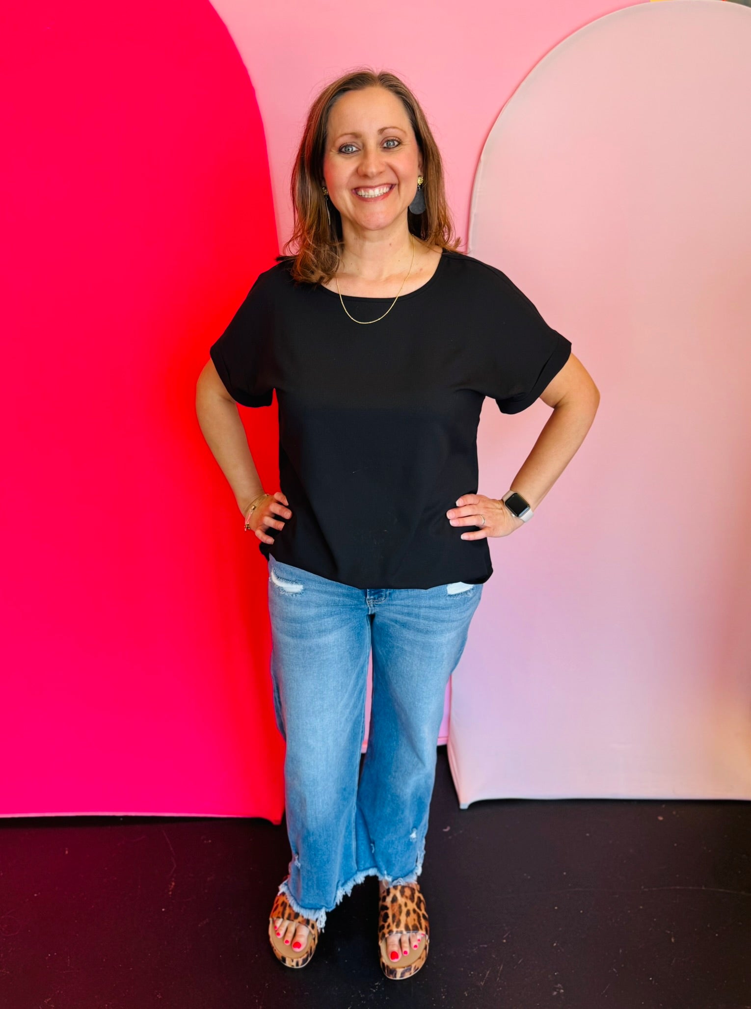 Make a splash with the Black Boat Neck Top! Its playful boat neck and rolled sleeves add a touch of fun to the woven heavy dobby fabric. A perfect addition to any wardrobe.