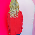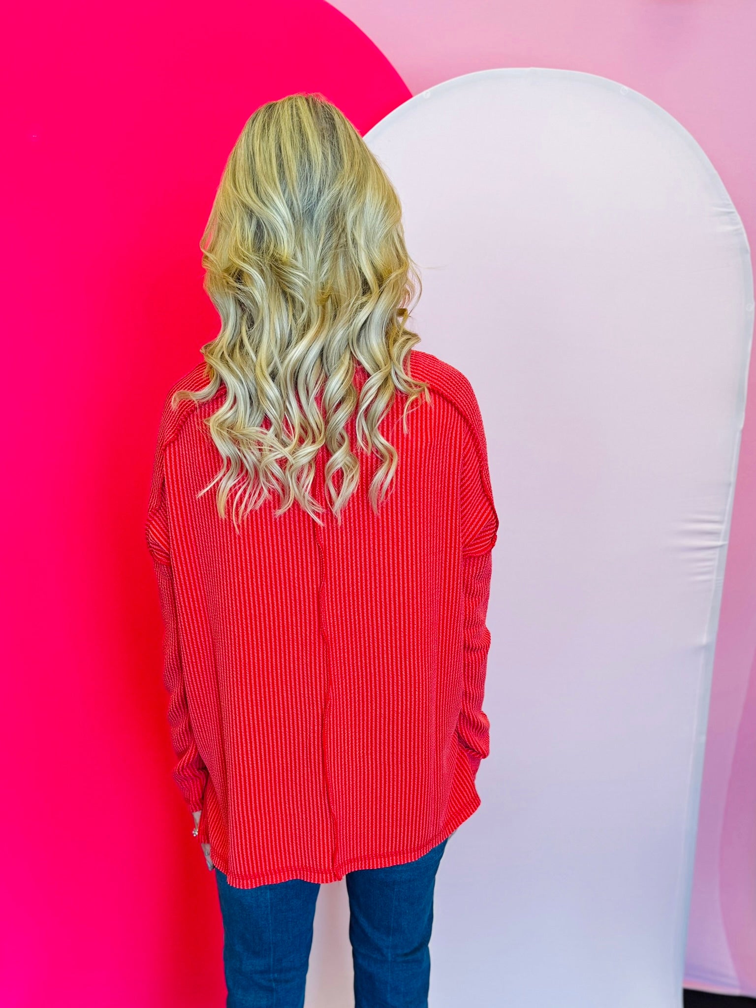 Say hello to effortless flair with our Red Ribbed Boat Neck Top! This is a must-have staple. This eye-catching long sleeve top features a stylish raised ribbed texture, raw edge detailing, and a flattering boat neckline for a modern silhouette. Its roomy fit and soft, stretchy fabric make it perfect for all-day comfort, whether you're dressing it up or keeping it casual.