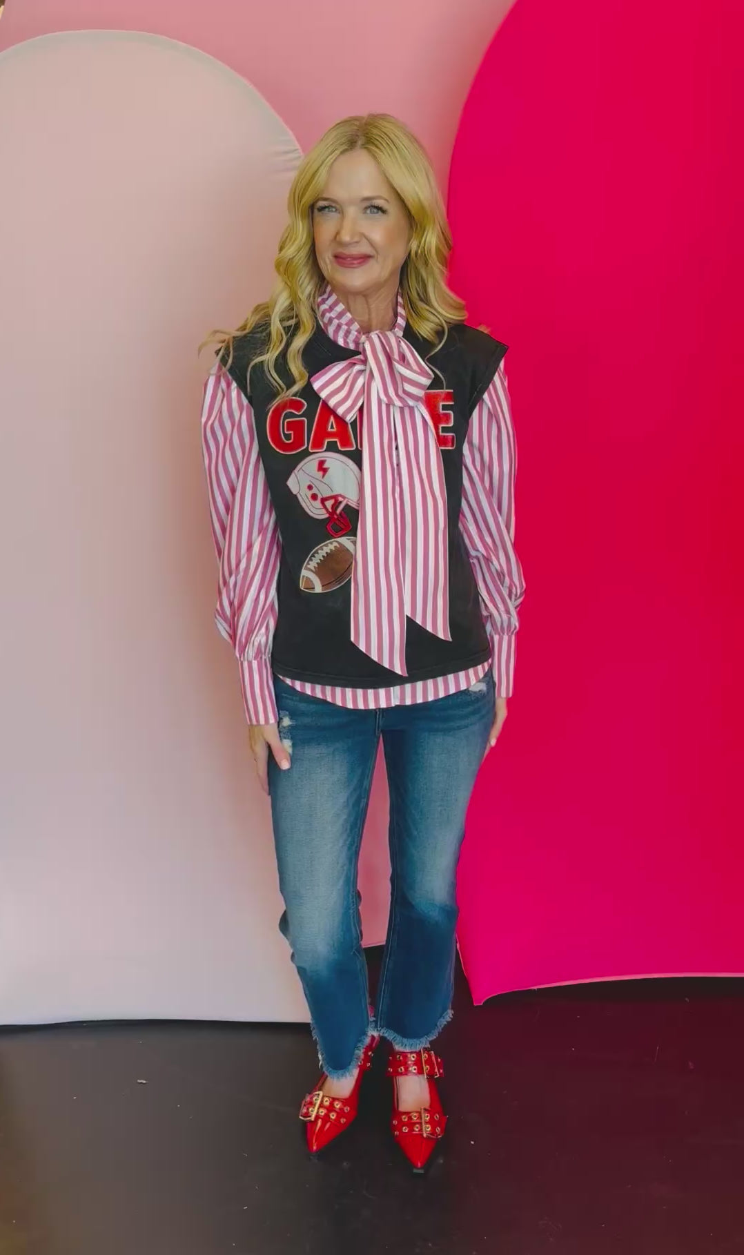 Add a bold pop of color to your game day style with our Red and White Striped Long Sleeve Large Pinstripe Button Up Top with Front Tie! Designed for versatility and flair, this standout piece features a striking red and white pinstripe pattern paired with a flattering tie-front detail. Whether you’re keeping it casual or going for a polished look, this button-up is the perfect piece to elevate your outfit. Lightweight and breathable, it’s ideal for layering under your sleeveless Game Day tees or wearing on its own for a crisp, chic vibe.