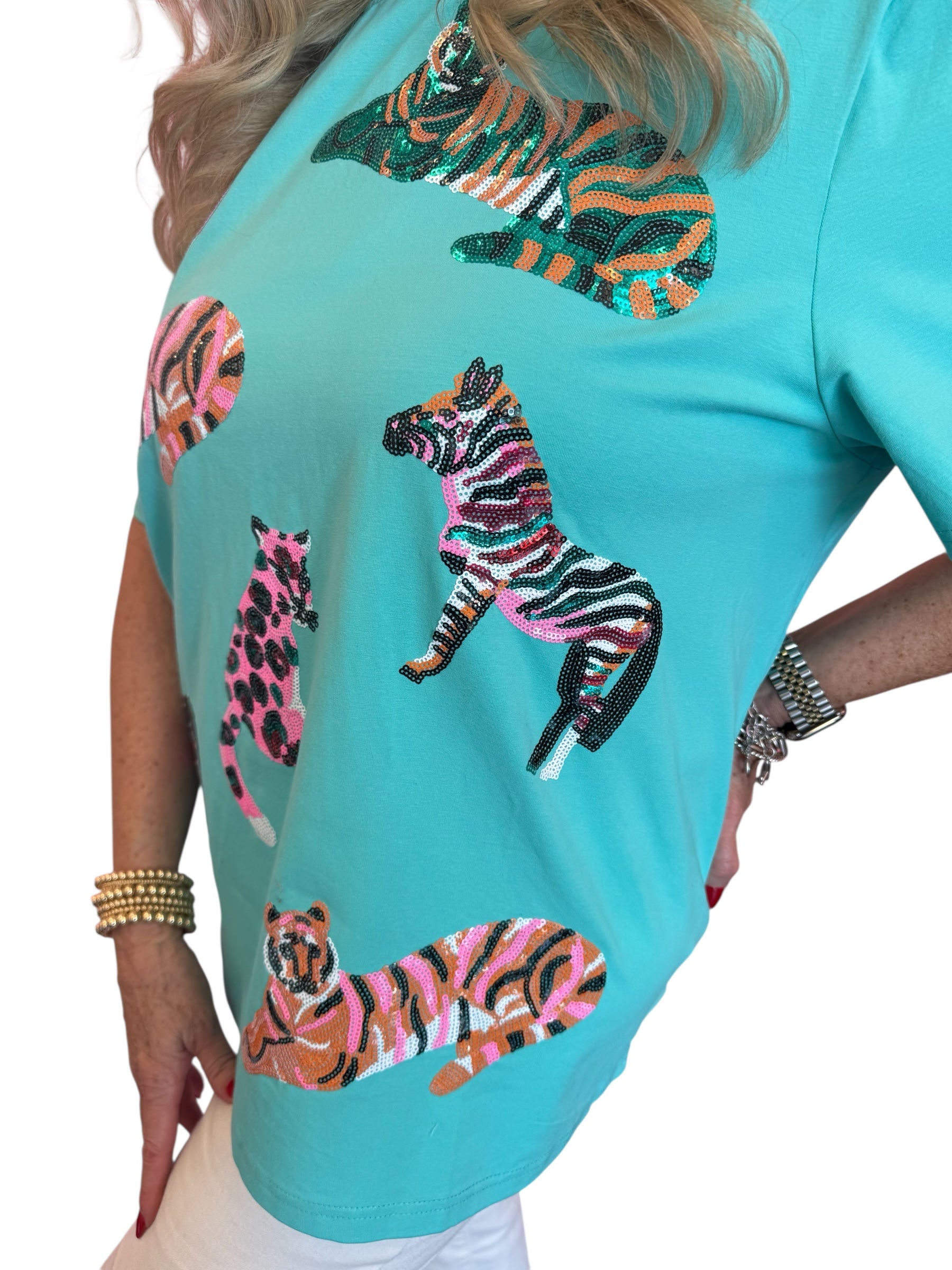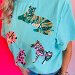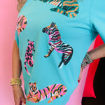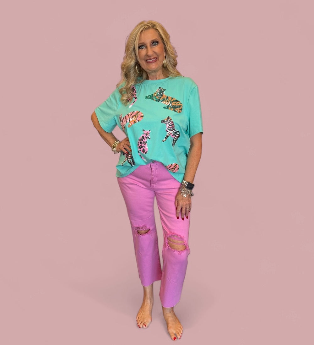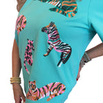 Unleash your wild side with our Roar Mint Tee. This ultra-soft tee, crafted from a comfortable blend of 96% cotton and 4% spandex, offers a perfectly relaxed fit with a hint of stretch. It features a stunning graphic of colorful, patterned tigers across the front, making a bold and artistic statement. The soft chalky mint background provides the perfect canvas for the vibrant design. It’s an effortlessly cool and comfortable piece, perfect for adding a touch of fierce style to your everyday wardrobe.