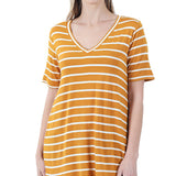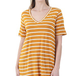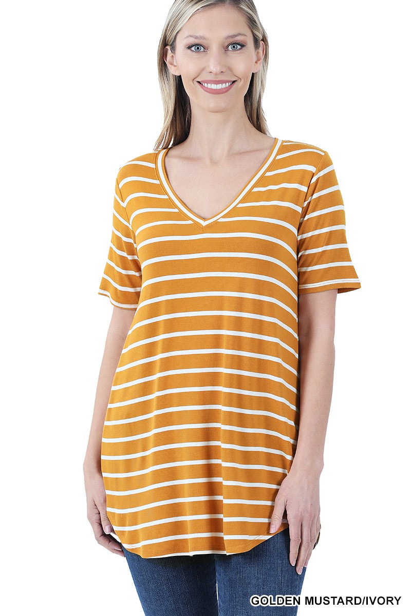 "Get ready to make a statement with our Mustard Striped Top! This V-neck, short-sleeve top features bold stripes for a playful look. Keep it casual with jeans or dress it up with a skirt for a versatile addition to your wardrobe. (Seriously, it's a must-have!)"