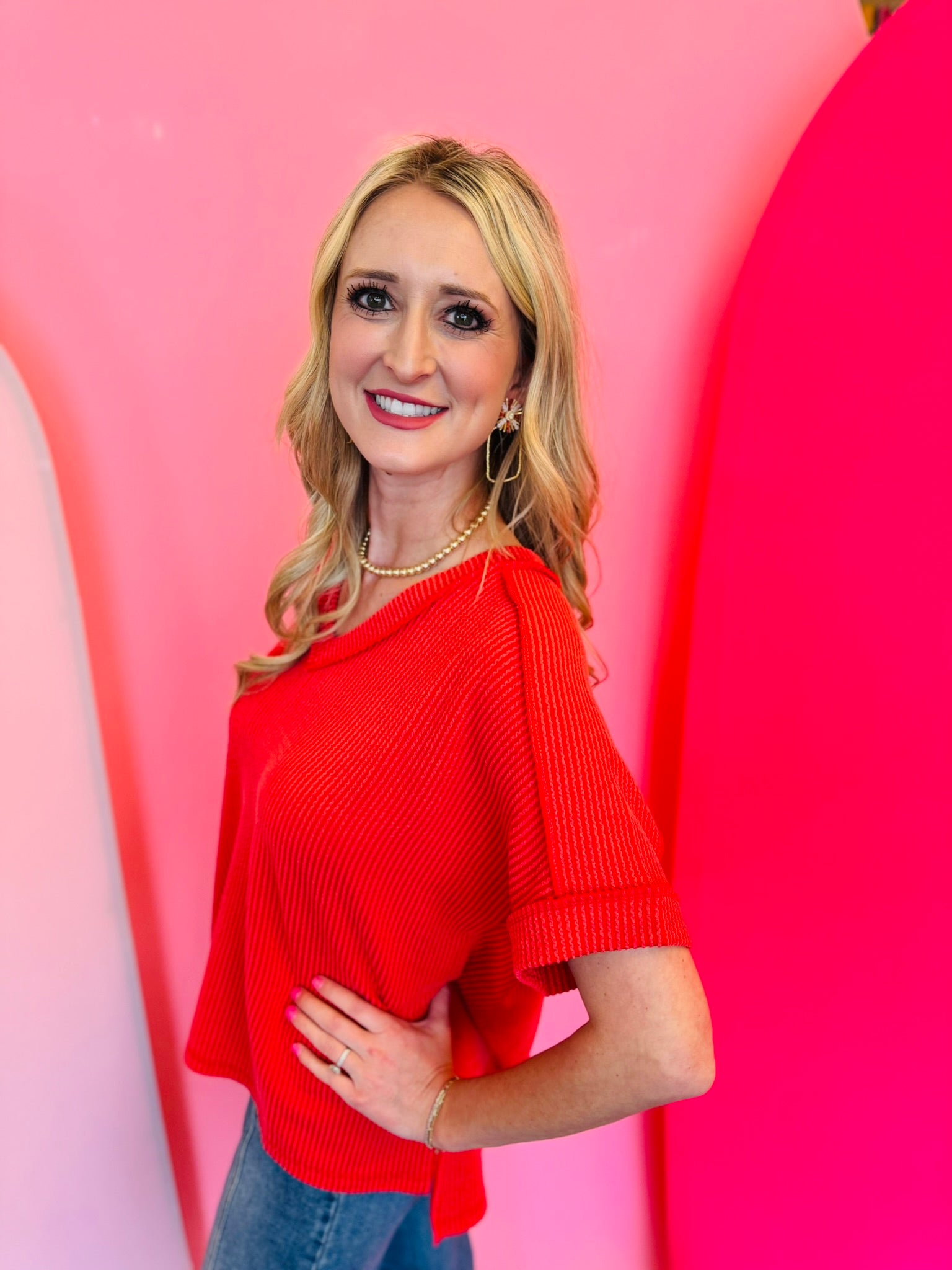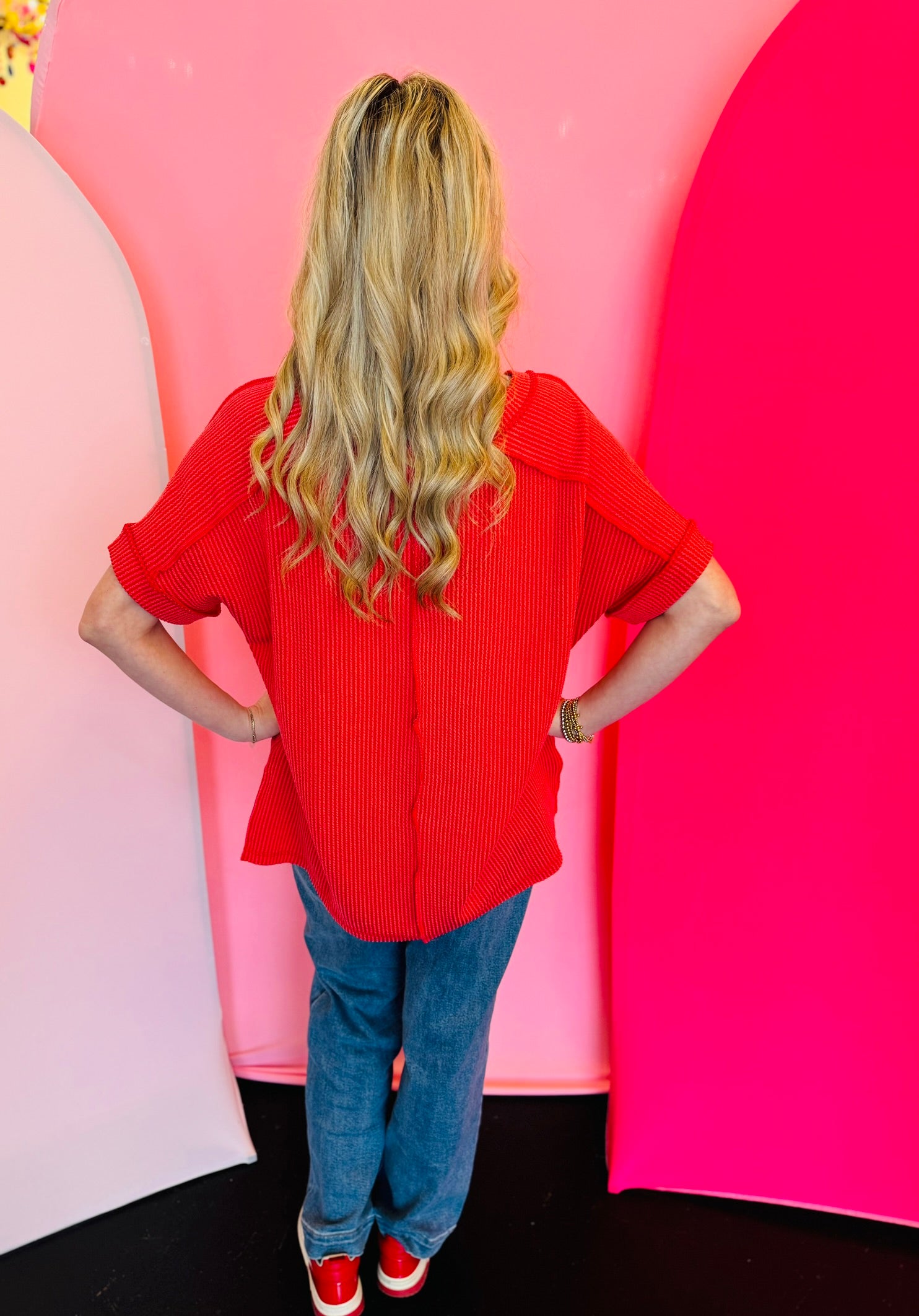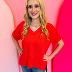 Get ready to rock your casual yet stylish look with our Red Corded Top! Made with a wavy corded rib knit, this top offers a relaxed fit and features short sleeves, a hi-low v-neck, and a unique texture that adds a touch of playfulness to your outfit. Perfect for any occasion, this top will surely make a statement!