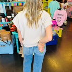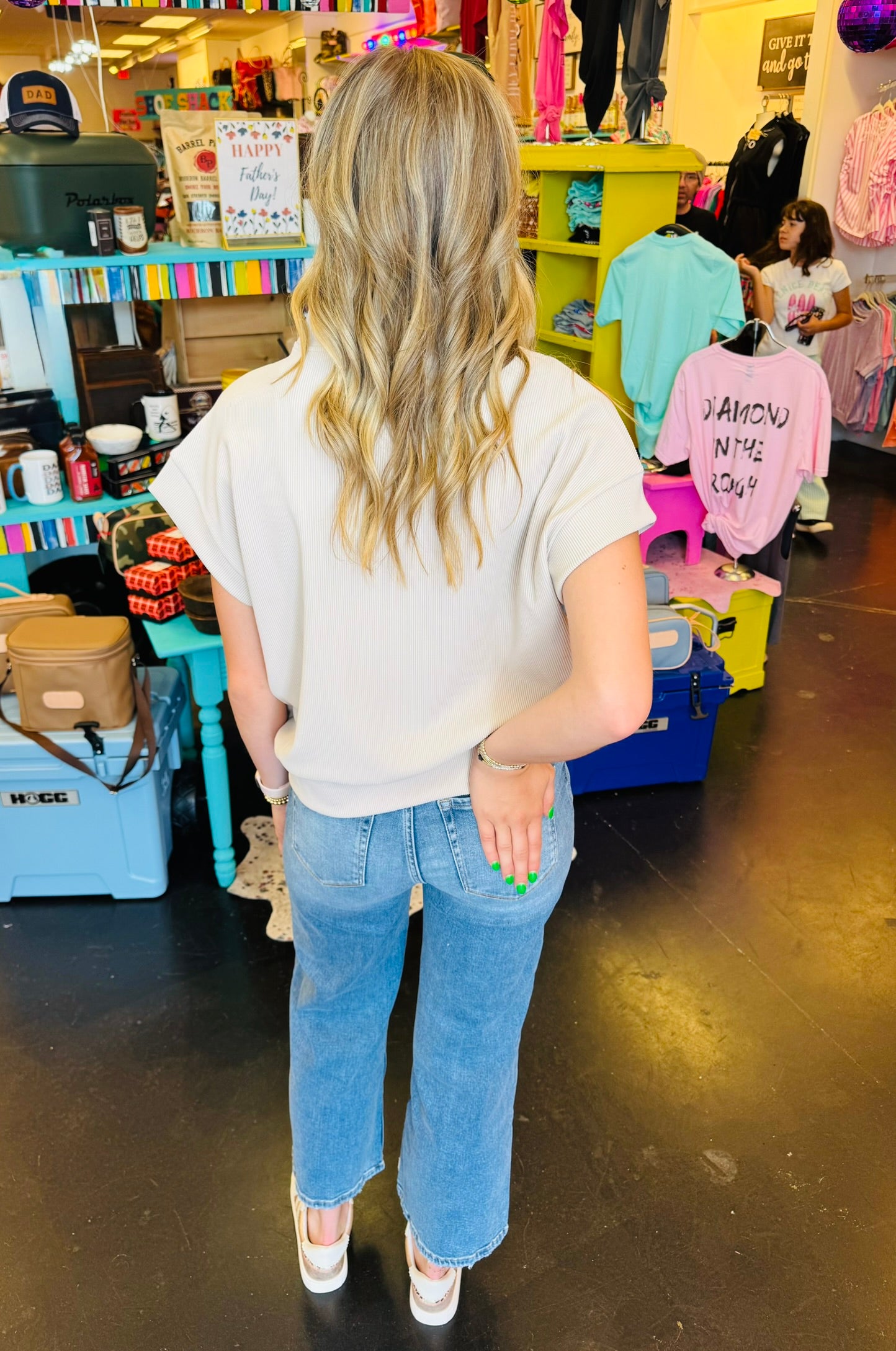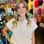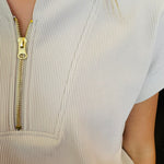 This sand beige half zip top adds a fun twist to your wardrobe with its shiny gold zipper and flirty cap sleeves. Perfect for layering or wearing solo, it’s a playful piece that brings effortless style and a touch of sparkle to any outfit.