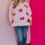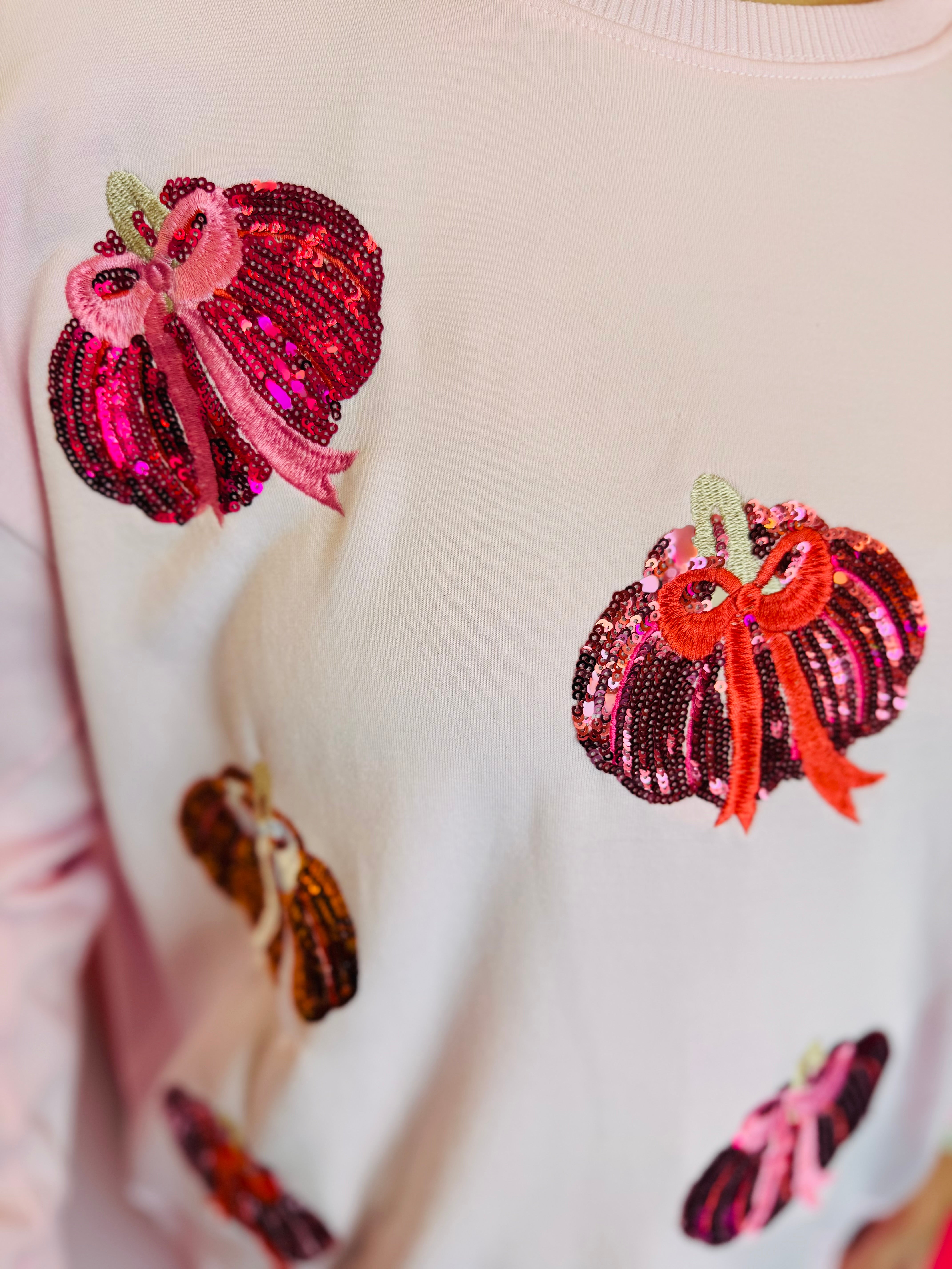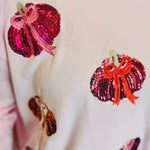 Add a playful pop of sparkle to your fall wardrobe with the Sarah Pumpkin Bows Sweatshirt. This pastel pink sweatshirt is made from a luxuriously soft blend of 62% polyester, 33% rayon, and 5% spandex, offering the perfect mix of stretch, breathability, and all-day comfort. Featuring pink and orange sequin pumpkins accented with embroidered bows, this sweatshirt brings festive charm and feminine flair to any cozy outfit.