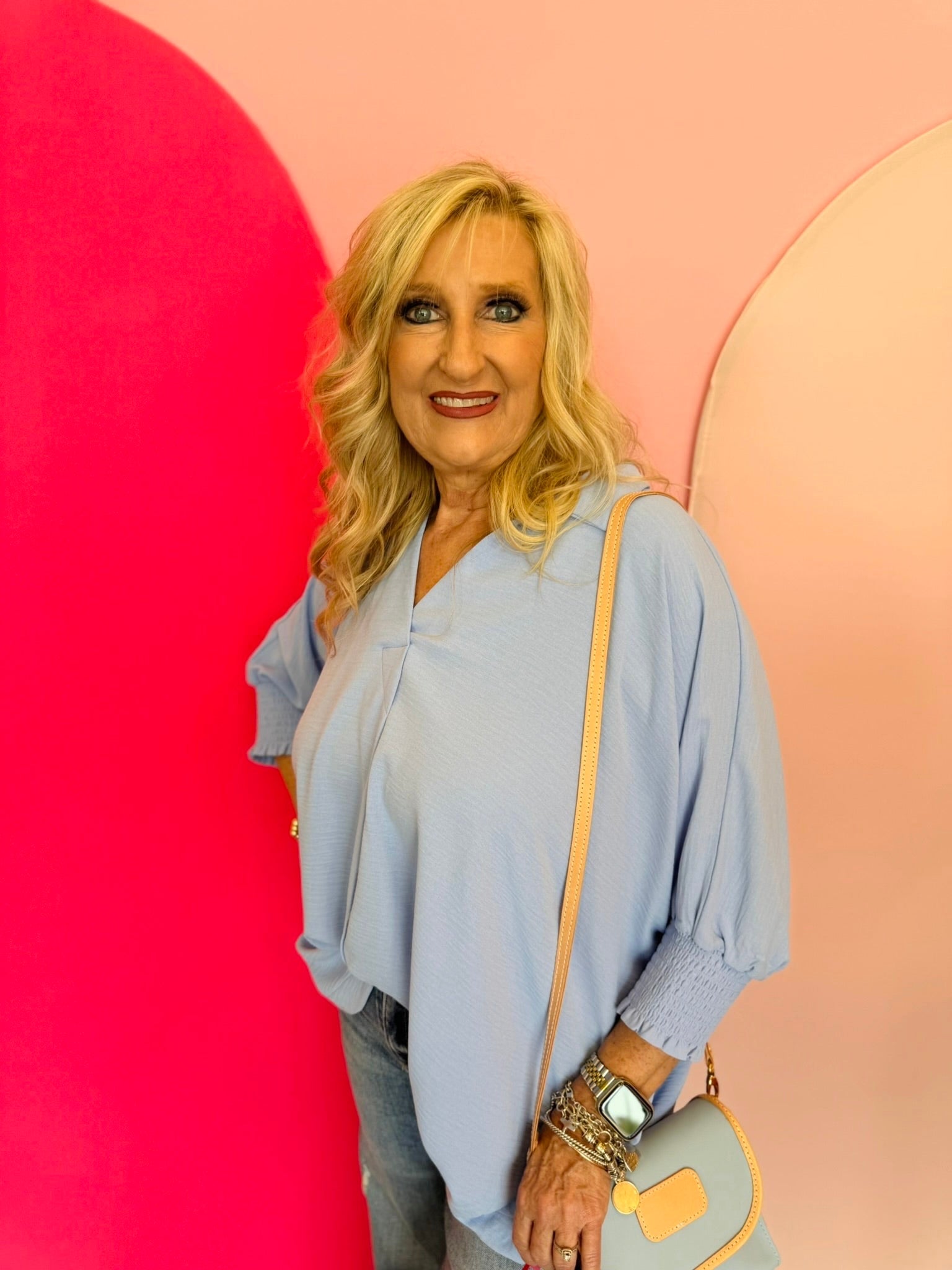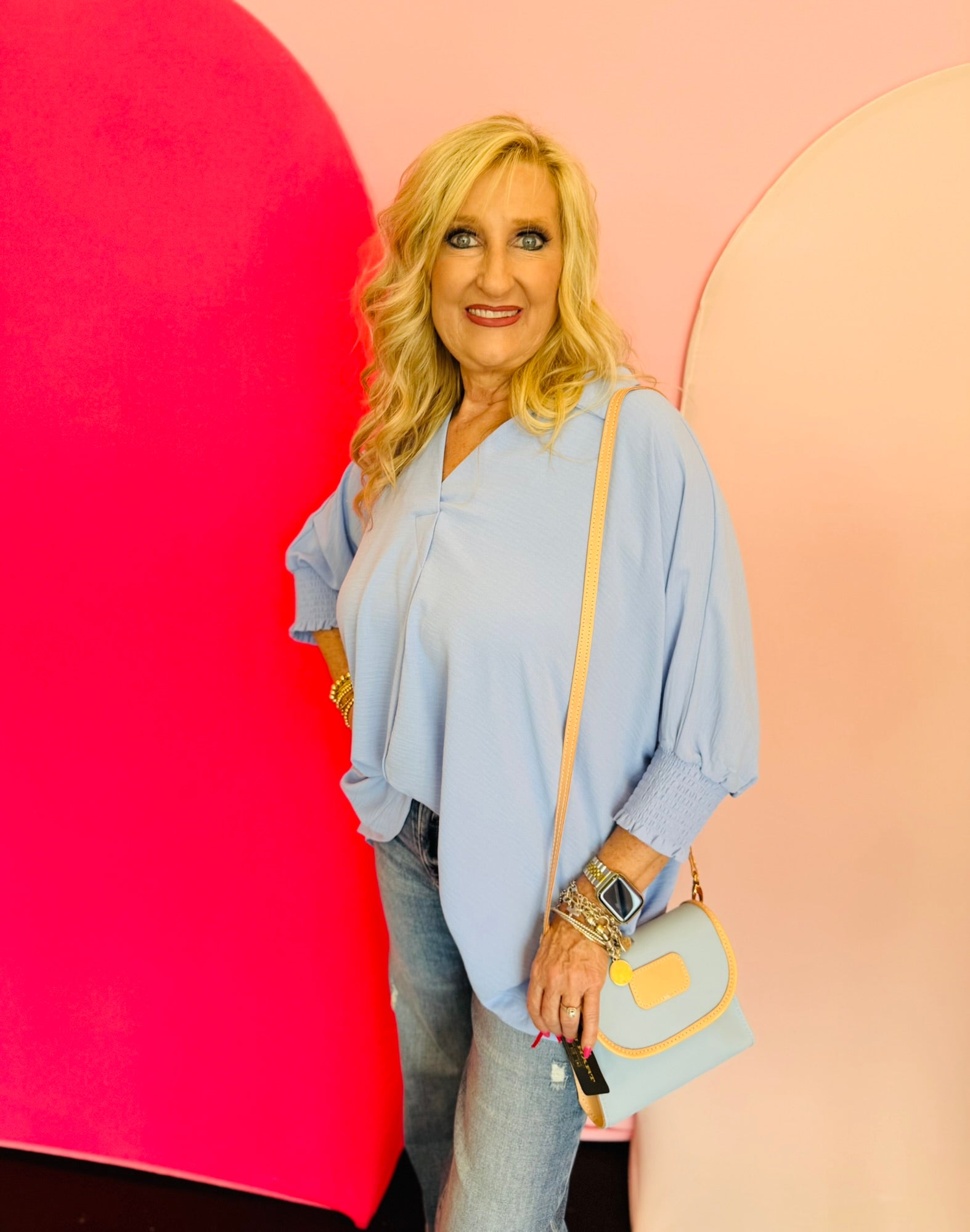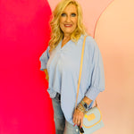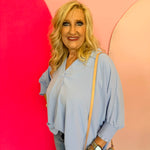 Elevate your everyday style with the Spring Blue Smocked Sleeve Top! Featuring a breezy airflow collar and charming smocked sleeve bands, this playful tee offers a flattering collared V-neckline perfect for any season. Lightweight and versatile, it’s your new go-to basic that adds a fun twist to any outfit year-round.