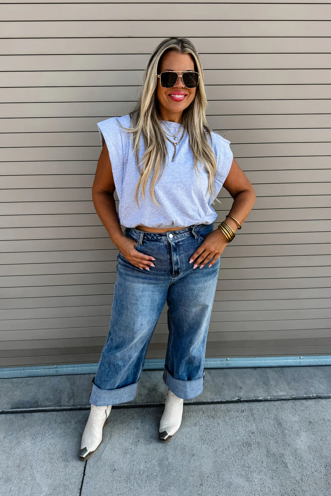 Introducing Stevie Grey Cap Sleeve Top - the must-have addition to your wardrobe. Its elastic waist and cap sleeves create a flattering silhouette perfect for pairing with our high-rise jeans. Don't miss out on this cute and stylish crop top that exudes sophistication and luxury. Elevate your fashion game today.